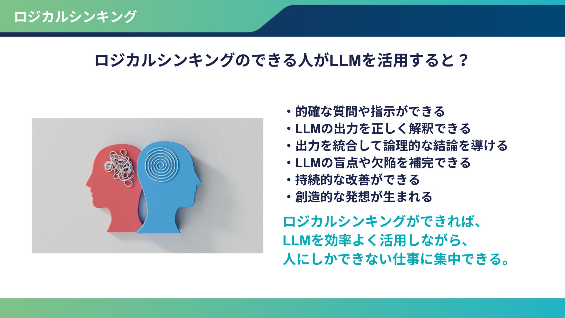 単なるツール操作に留まらず、AI時代に不可欠なロジカルシンキング(MECE)や課題解決力、仮説構築力といった人間の思考力をセットで強化します。