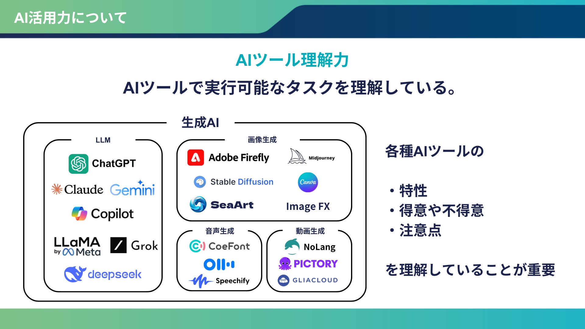 ChatGPTだけでなく、画像生成、資料作成、文字起こし、AI検索など、17種類以上の多様な生成AIツールの特徴と実務での使い分けを網羅的に学びます。