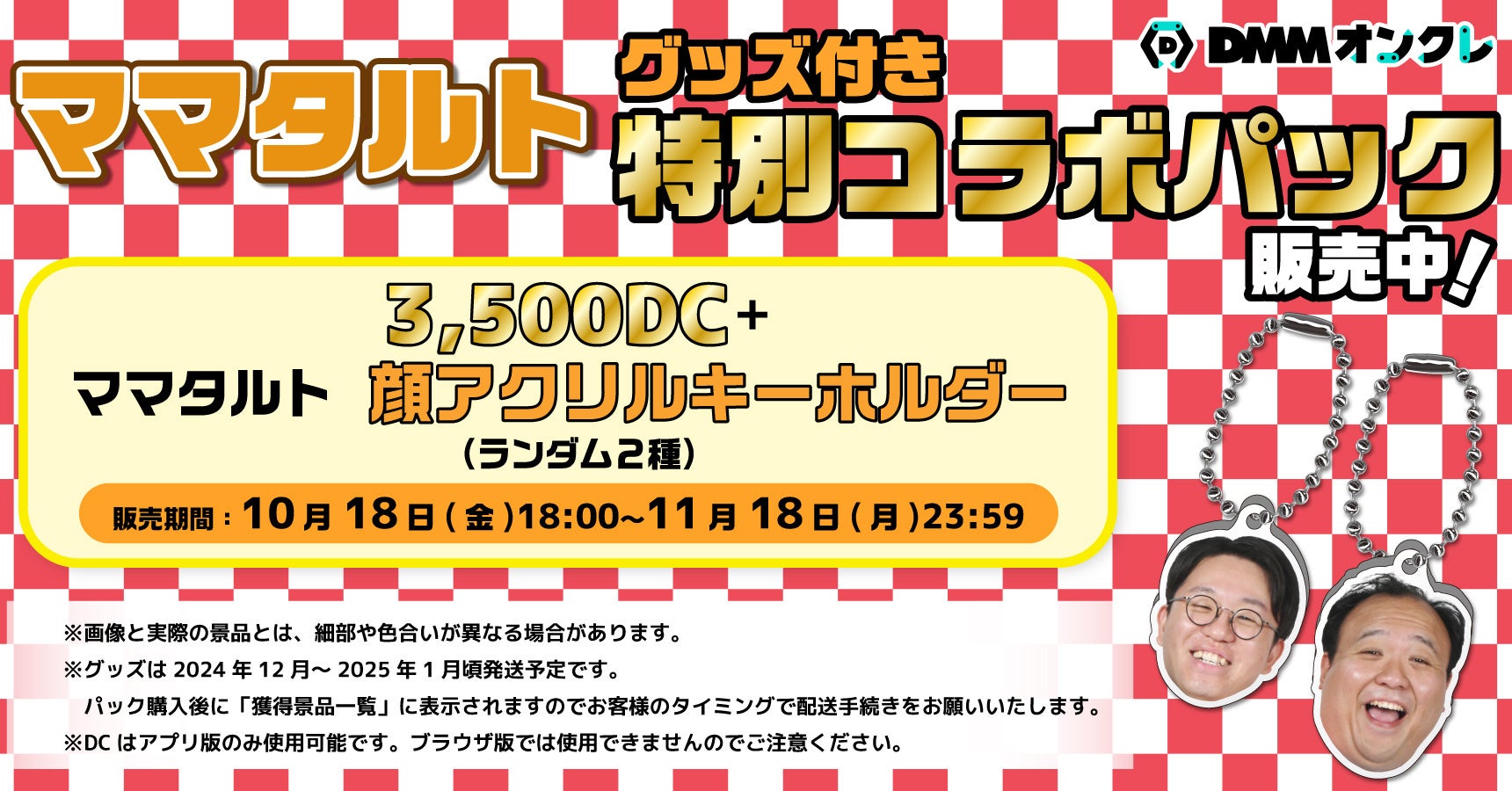DMMオンクレのプレイに必要なDC(3,500DC)と、ママタルトの2人がプリントされたアクリルキーホルダー(ランダム)がセットになったお得なDCパックを販売します。