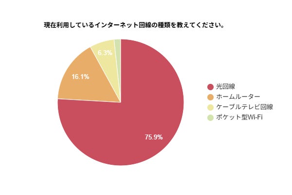 現在利用しているインターネット回線の種類についてアンケートを実施したところ、75.9%が「光回線」を利用していると回答しました。次いで「ホームルーター」が16.1%、「ケーブルテレビ回線」が6.3%となっており、高速・安定性に優れた光回線が主流であることが分かります。