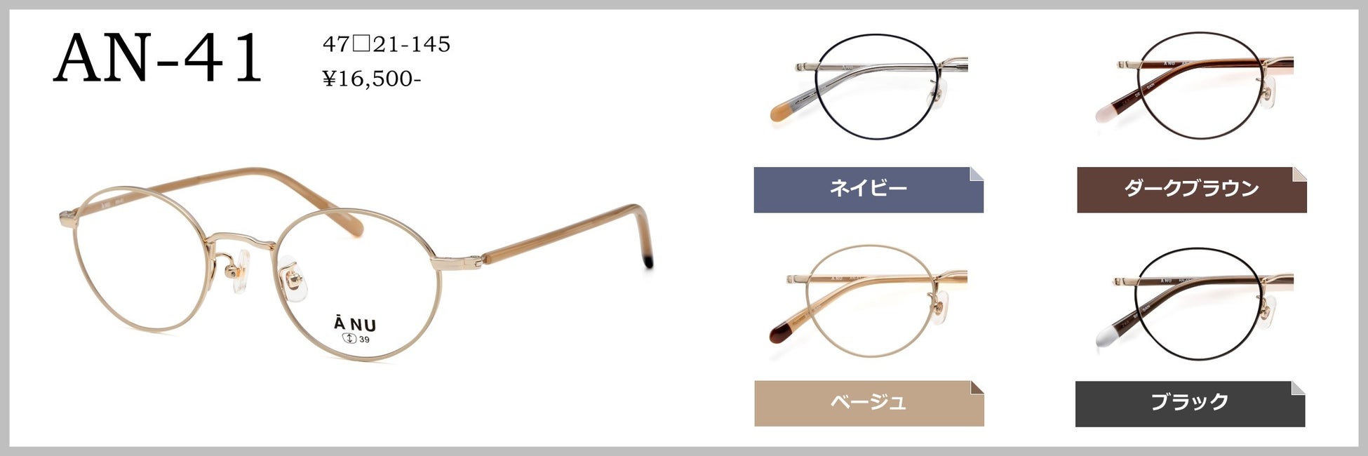 AN-41(47□21-145)ボストンの印象を取り入れたオーバルシェイプ。細身のリムデザインで知的な印象を与えますが、長モダンにしサイドに色を入れることで、カジュアルで優しい印象を演出します。カラーは、ネイビー、ダークブラウン、ベージュ、ブラックの4色。