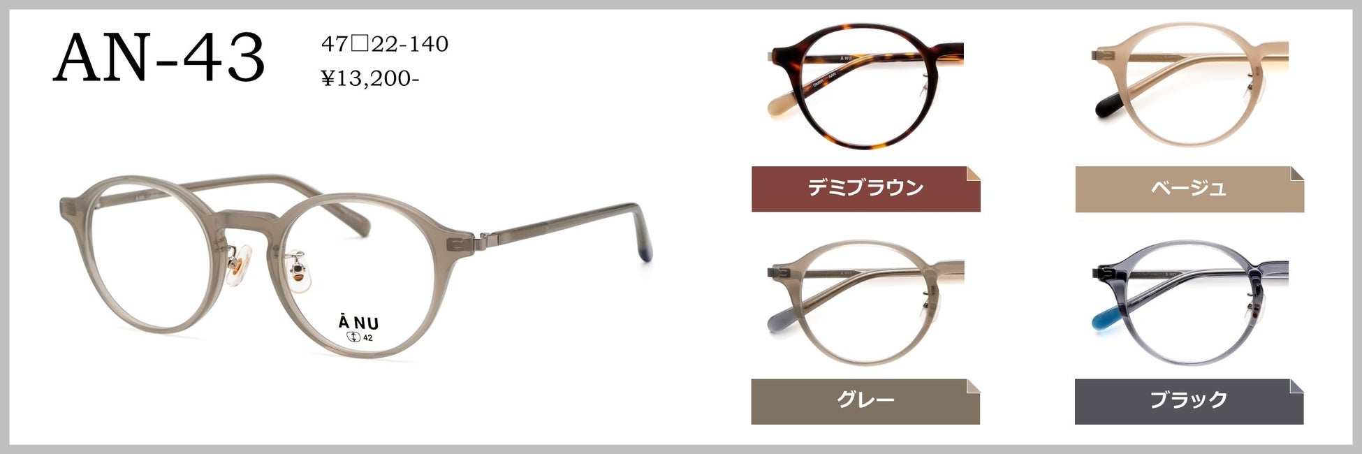 AN-43(47□22-140)小ぶりなサイズ感で可愛らしい印象を与えるボストンシェイプ。細身のフロントとシンプルな構造ですっきりとしたデザインに仕上げました。カラーは、デミブラウン、ベージュ、グレー、ブラックの4色。