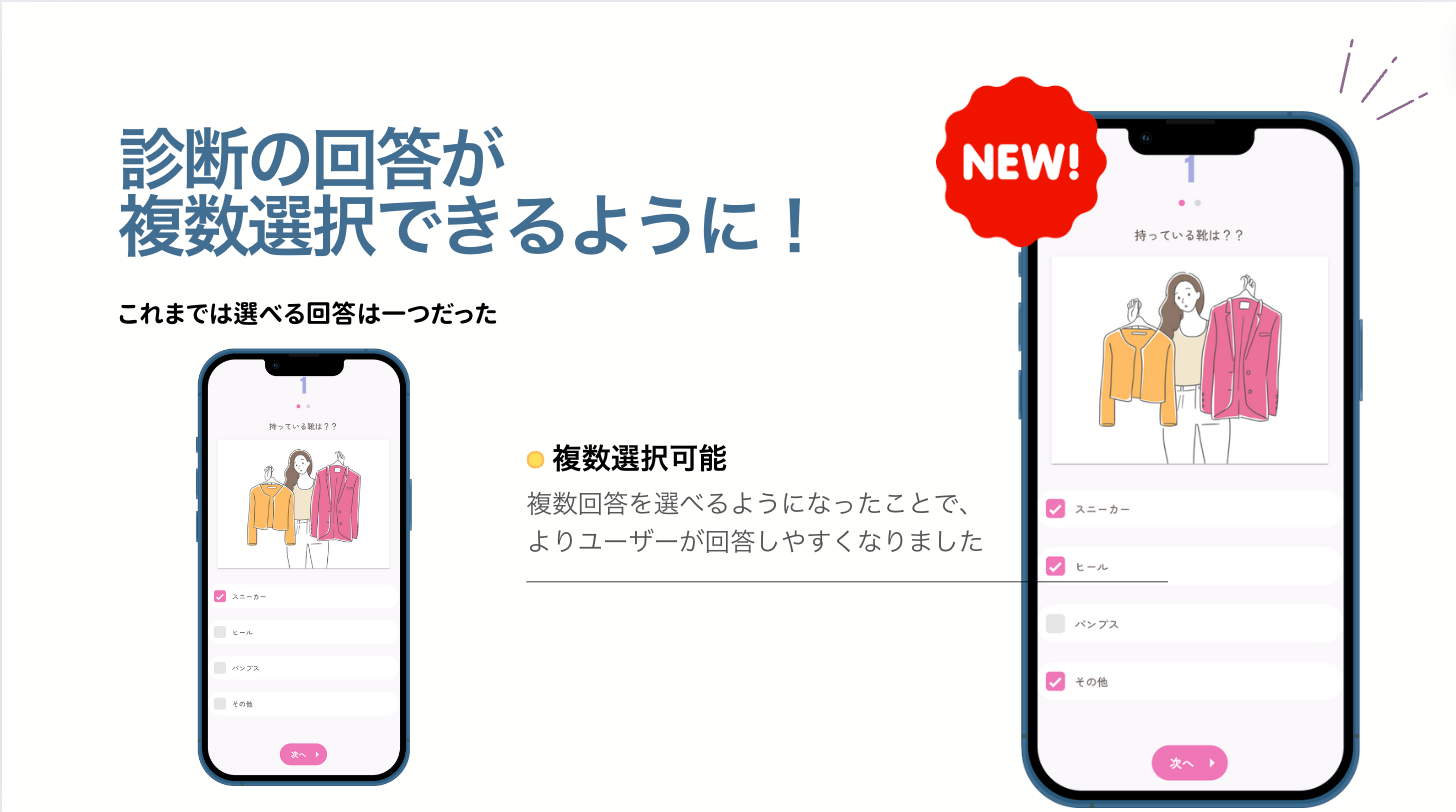 よりユーザーにありのままに診断を行ってもらうために、複数回答機能の実装とそれに伴う結果の反映ができないかとのご要望でした。
