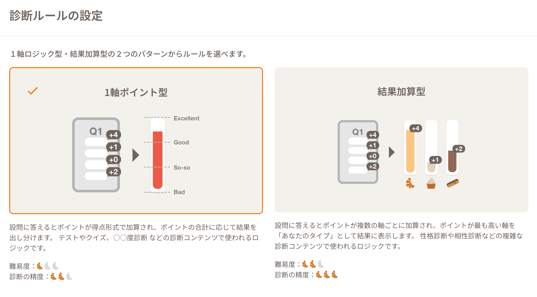 診断のロジックは、習熟度診断やクイズに使われる「1軸ロジック型」とタイプ診断によく使われる「結果加算型」の2パターンがあります。
