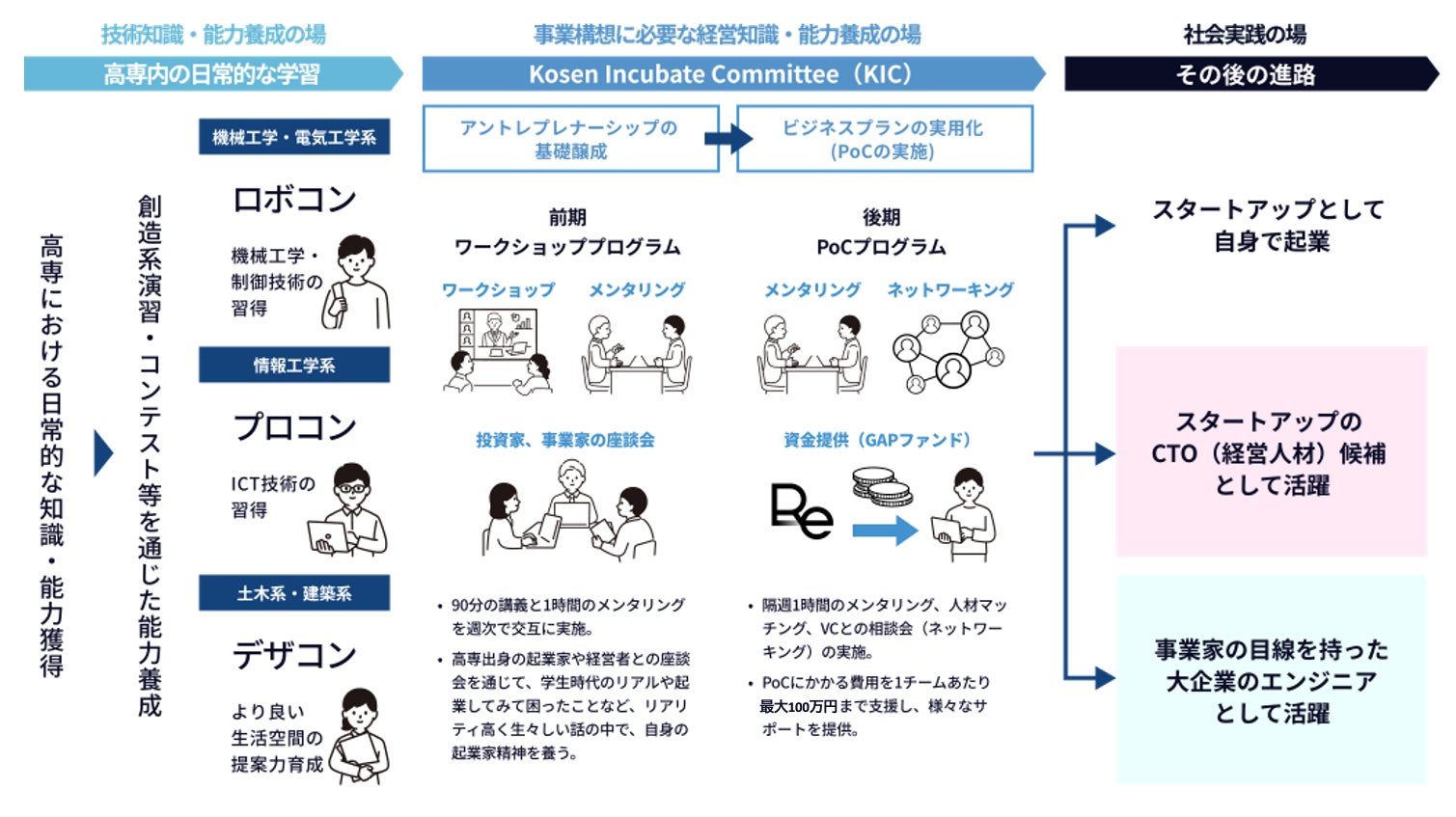 弊社はKICを通じて、起業家やスタートアップ、経営⼈財として重要なアントレプレナーシップを醸成し、全国の⾼専⽣のキャリア形成につなげていきます。