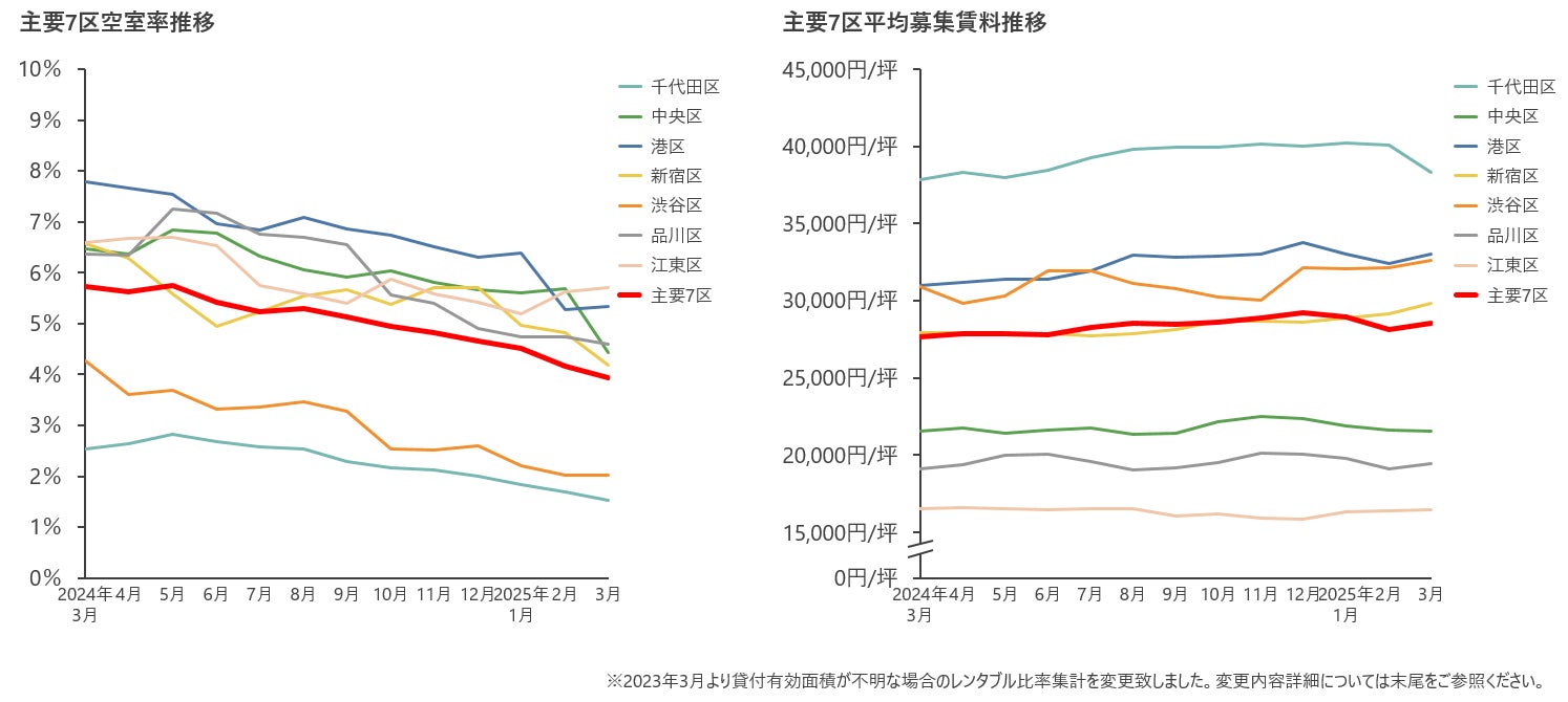 【2025年3月末時点の主要7区空室率・平均募集賃料の動向】