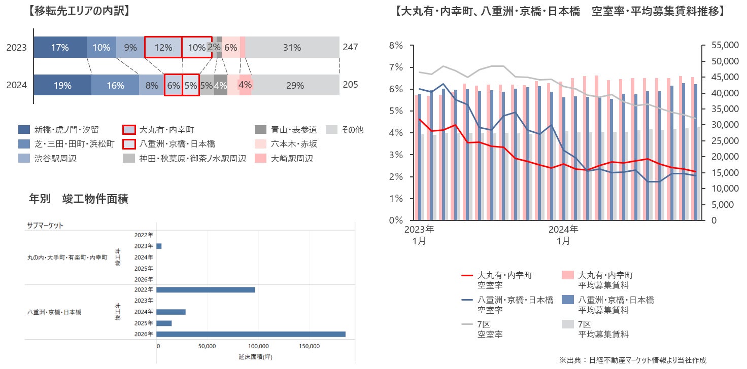 2023年1月~2024年12月(記事公開日ベース)における都心7区のオフィス移転先について、「大丸有・内幸町エリア」、「八重洲・京橋・日本橋エリア」の占める割合が大幅に低下している。上記2エリアは、2022年以降の新規供給量が限定的であることなどが影響し、空室率は低下傾向となっており、平均募集賃料についても、都心7区が2万円台/坪を推移しているのに対し、4万円台/坪を推移している。東京駅周辺のエリアは交通利便性が高く、引き続き人気のエリアではあるものの、拡張移転がトレンドとなっていることや、空室が少なく、平均募集賃料も高騰していることから移転件数が減少していると思われる。