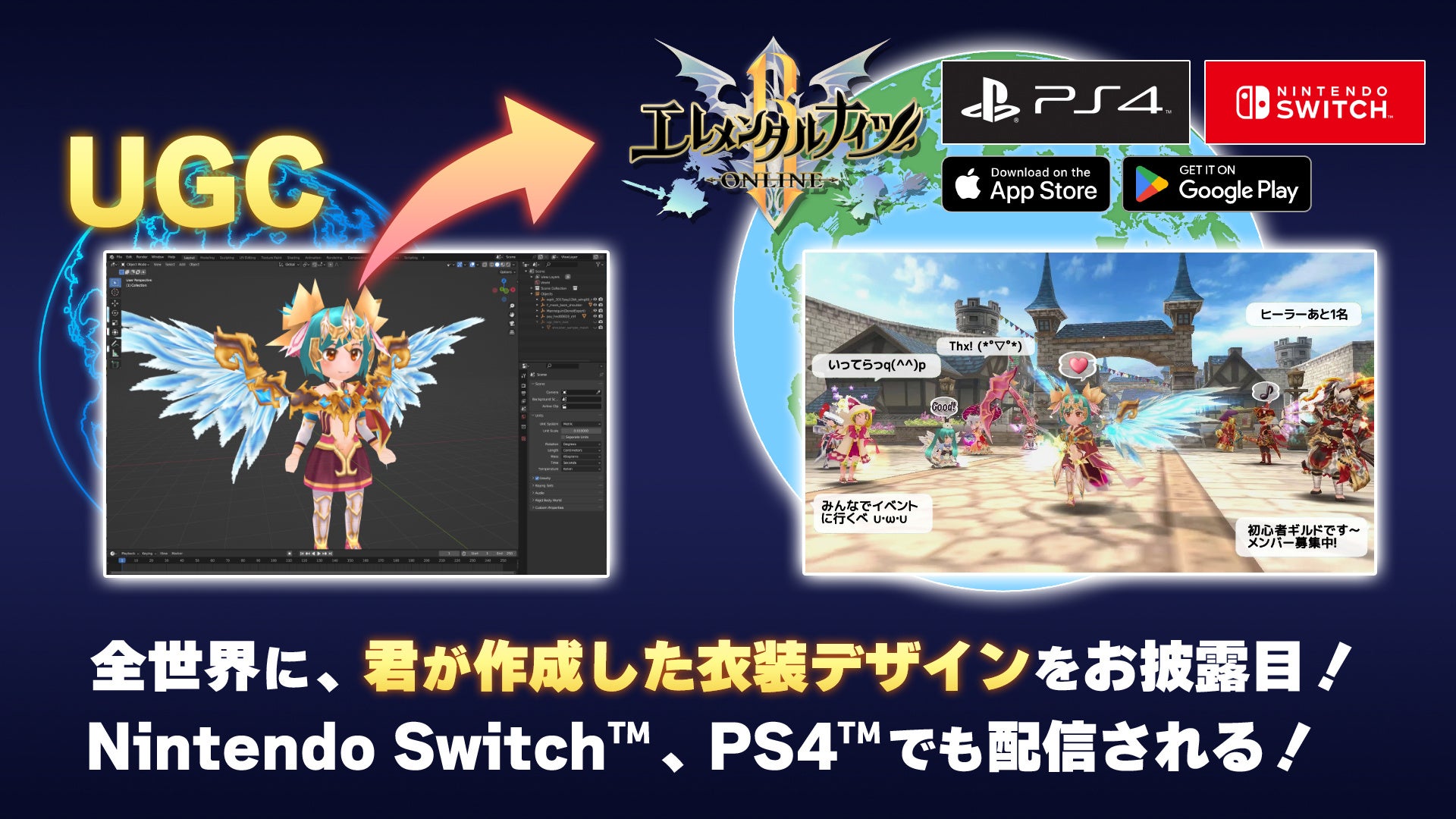 『エレメンタルナイツR』は、日本・アジア・北米・欧州など世界展開しているオンラインゲームであり、iOSとAndroidといったスマートフォンで遊べるほか、NintendoSwitch™やPS4™などの家庭用ゲーム機でも遊ぶことができるので、ユーザーが作成した衣装を、世界中、また多くのプラットフォームでお披露目をすることができるようになります。