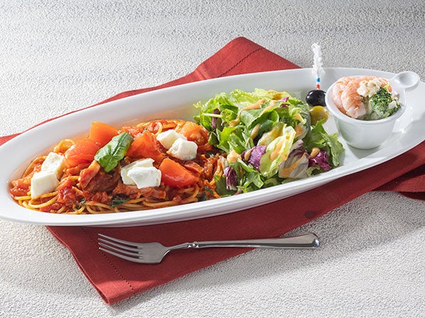 FLOの洋惣菜「トマトと水牛モッツァレラのサラダ」の食材とレシピを使用してアレンジした、お野菜たっぷりで彩り豊かなパスタメニュー。