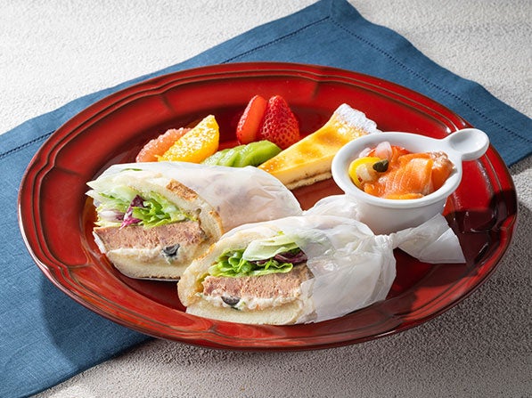 FLOの洋惣菜・定番人気の「ポテトサラダ」を敷き込み、ロングセラーの「パテドカンパーニュ」を贅沢に厚切りにして、バターで焼いたソフトフランスパンで包み込んだ食べ応え満点のロールサンドです。