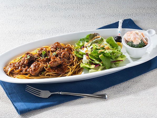 FLOの洋惣菜「デミグラスソースのハンバーグ」を使用したアレンジパスタ。ハンバーグ肉がごろごろと入った満足感の高い一品です。