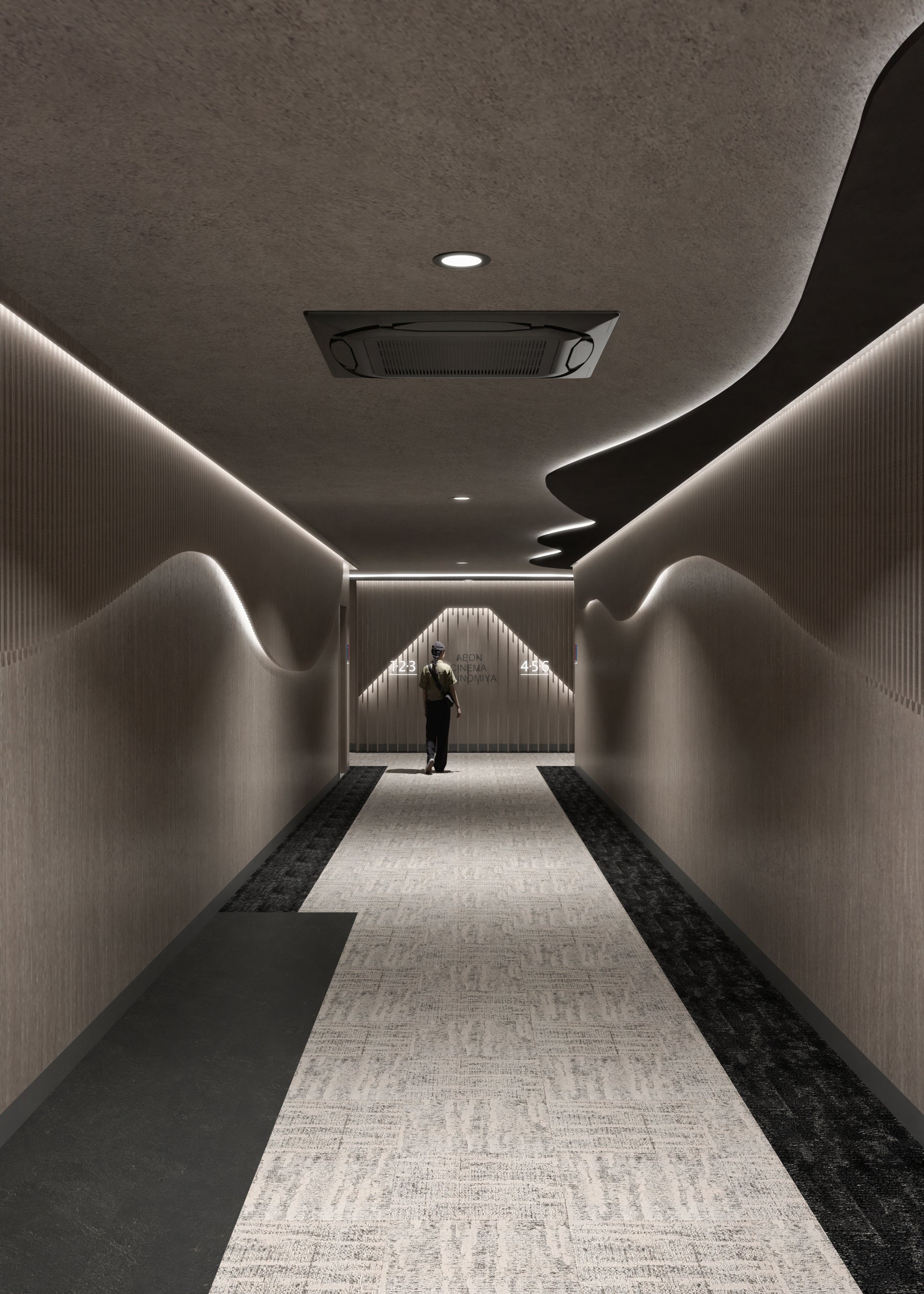 スクリーンへ向かうコリドール(通路)にも、富士山をモチーフにした内装デザインを採用。山頂を目指すような非日常に入り込むイメージを膨らませてくれます。
