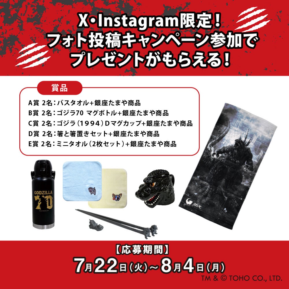 コラボ商品を購入いただき、その内容をXまたはInstagramに投稿していただいた方の中から【ゴジラグッズ】と【銀座たまや商品】を抽選で20名様(X10名、Instagram10名)にプレゼント。