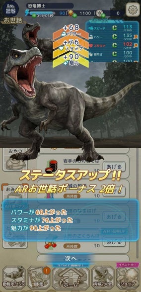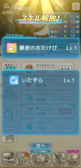 復元させた育成対象の動物に育成アイテムを使ってお世話することで動物の能力を上げることができます。それぞれの能力を上げていく中で、お世話アイテムのあげ方によって特別なスキルを解放することができ、大会での競争結果に影響します。
