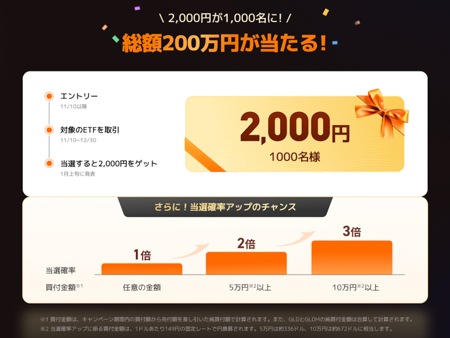 本キャンペーンは、対象期間中にキャンペーンにエントリーし、ステート・ストリート・インベストメント・マネジメントが提供するゴールドETFである「SPDR® ゴールド・シェア(GLD)」または「SPDR® ゴールド・ミニシェアーズ・トラスト(GLDM)」を買付けいただいたお客様を対象に、現金2,000円が抽選で当たるものです。さらに、5万円以上の買付けを行っていただいたお客様は当選確率が2倍に、10万円以上の買付けを行っていただいたお客様は当選確率が3倍になる、ダブル&トリプルチャンスもあります。ぜひこの機会に、金の資産運用に注目されてみてはいかがでしょうか。