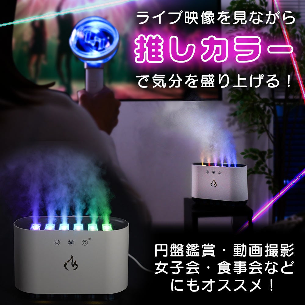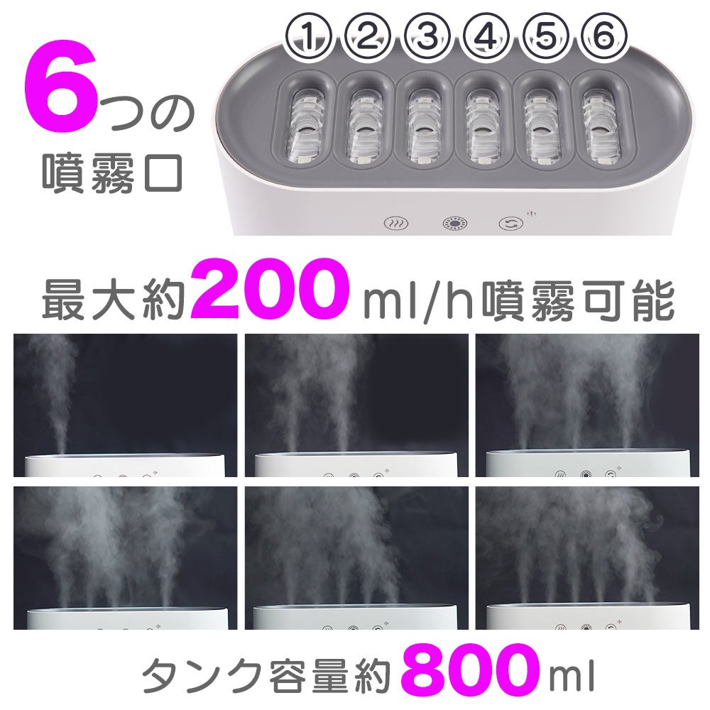 噴霧口6口、1口から6口まで噴霧量の調整が可能。通常のモードと音に反応するモード(ビートモード)を搭載。ビートモード時は周囲の音に反応し、LEDとともに1口から6口の噴霧口からミストが噴霧されます(LEDの色はランダムとなります)。通常モード時にはLEDの色を19色から固定することが可能。自動で色が変わるグラデーションパターンを5種類搭載。お好みのアロマオイルをタンク内に垂らして使うことも可能。