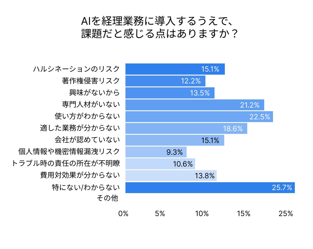 最多は「特にない/わからない」(25.7%)であり、多くの現場ではAIに対する課題意識そのものがまだ曖昧なままであることが伺えます。