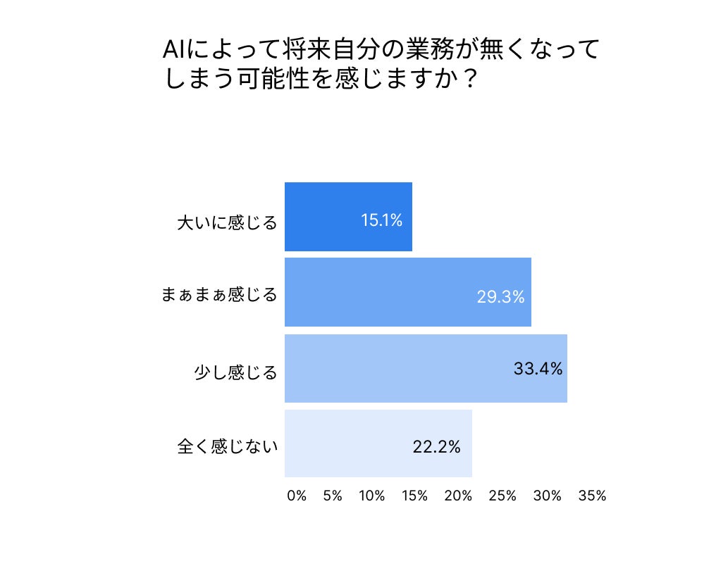 加えて、上記のグラフによると「大いに感じる」(15.1%)、「まぁまぁ感じる」(29.3%)、「少し感じる」(33.4%)を合わせると、約78%が業務がなくなってしまう可能性を意識していることがわかります。これはレポート中の「AIが経理業務をほぼ自動化してしまう可能性に危機感を感じますか」という設問の結果と似た傾向を示しています。この一致は、自動化の進展そのものに対する危機感と、自身の職務の将来に対する不安とが、ほぼ同じ感覚として捉えられていることを示唆しています。