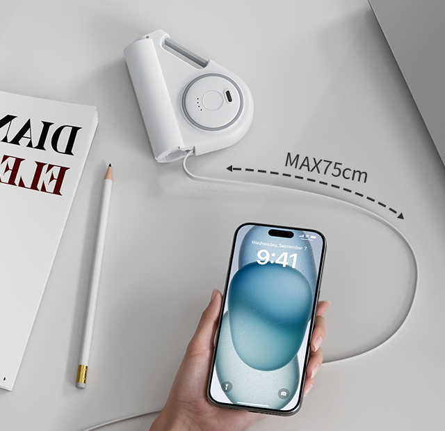 このモバイルバッテリーは機能性とデザイン性を兼ね備えており、スマートフォンのバッテリーが切れたら、ケーブルを引き出すだけですぐに充電できます。