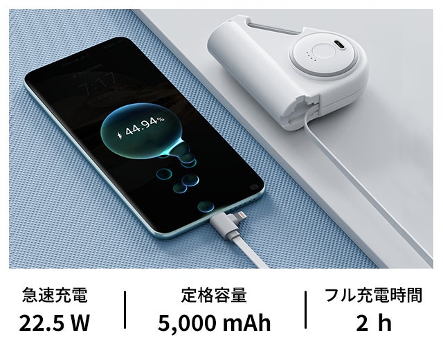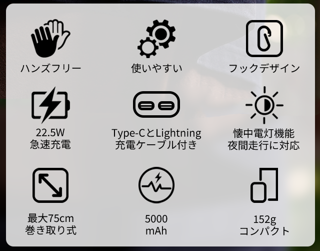 「両手が自由に使える」「Type-CとLightningの2ポートを搭載」「152g軽量」「5,000mAh」