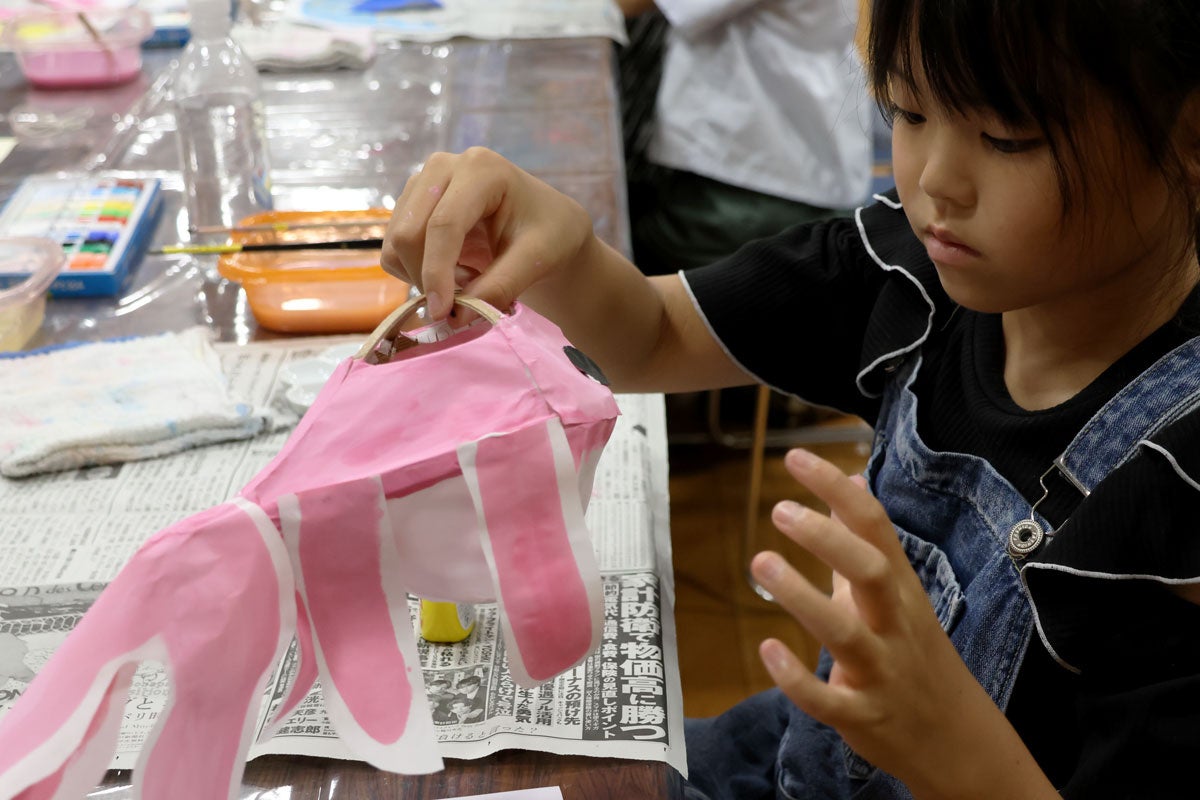 この日、参加者は、同館の企画展で実際に展示されている「金魚ちょうちん」をはじめ、鯛や船をかたどった灯りの郷土玩具について学芸員から解説を受けた後、骨組みに和紙を貼り付けていきました。また、丸い胴体と長い尾ヒレに水彩絵の具を使ってそれぞれ好きな色で模様を描き染色しました。参加者は、完成した金魚ちょうちんを見て「大好きな色と模様の金魚ができてうれしい。どこに飾ろうかな。」と楽しんでいました。