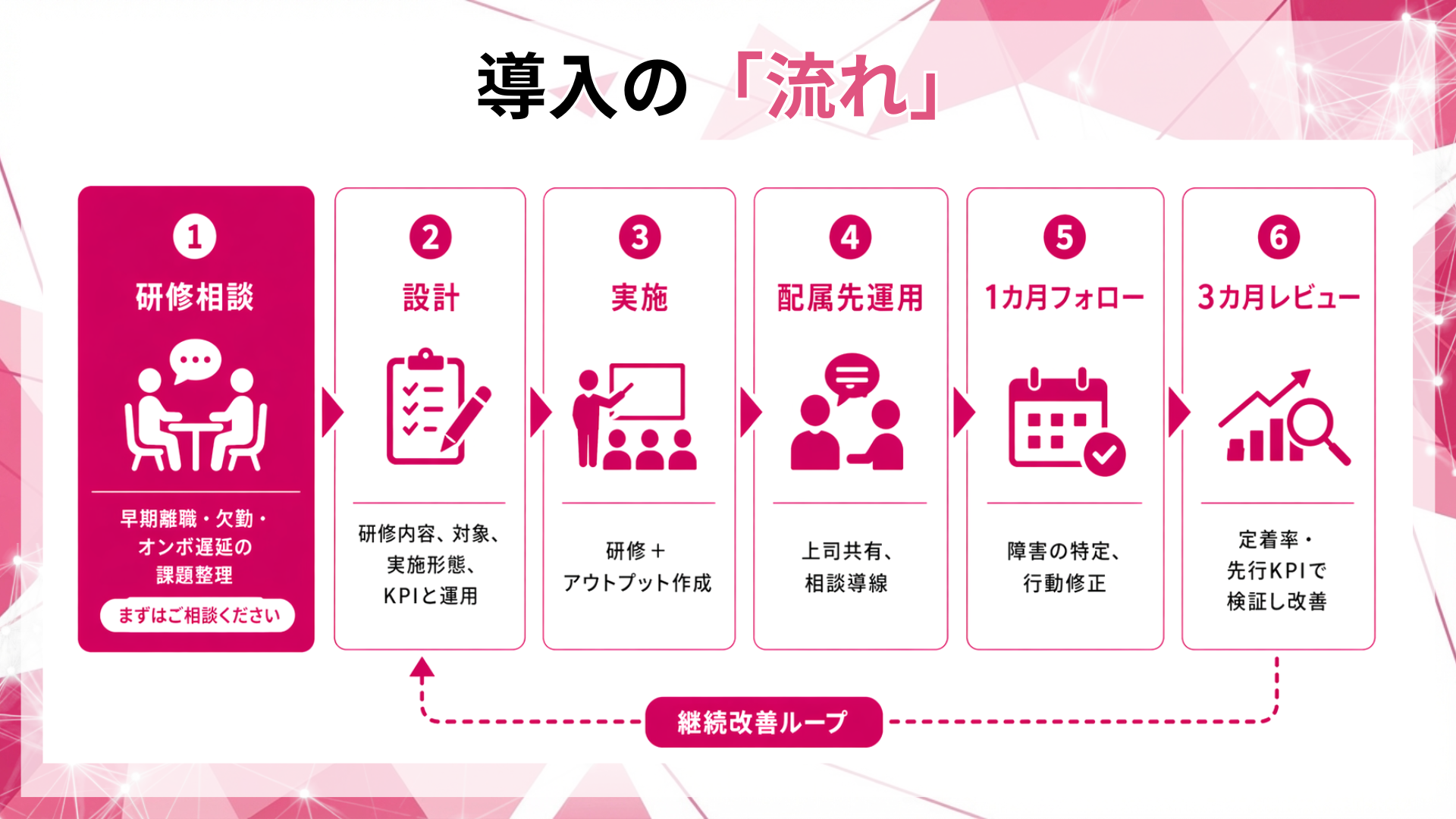 本支援は、研修内容の提供に加え、配属後の運用(上司の受け止め、相談導線、1〜3カ月フォロー)まで含め、定着率で説明できる形へ落とし込みます。