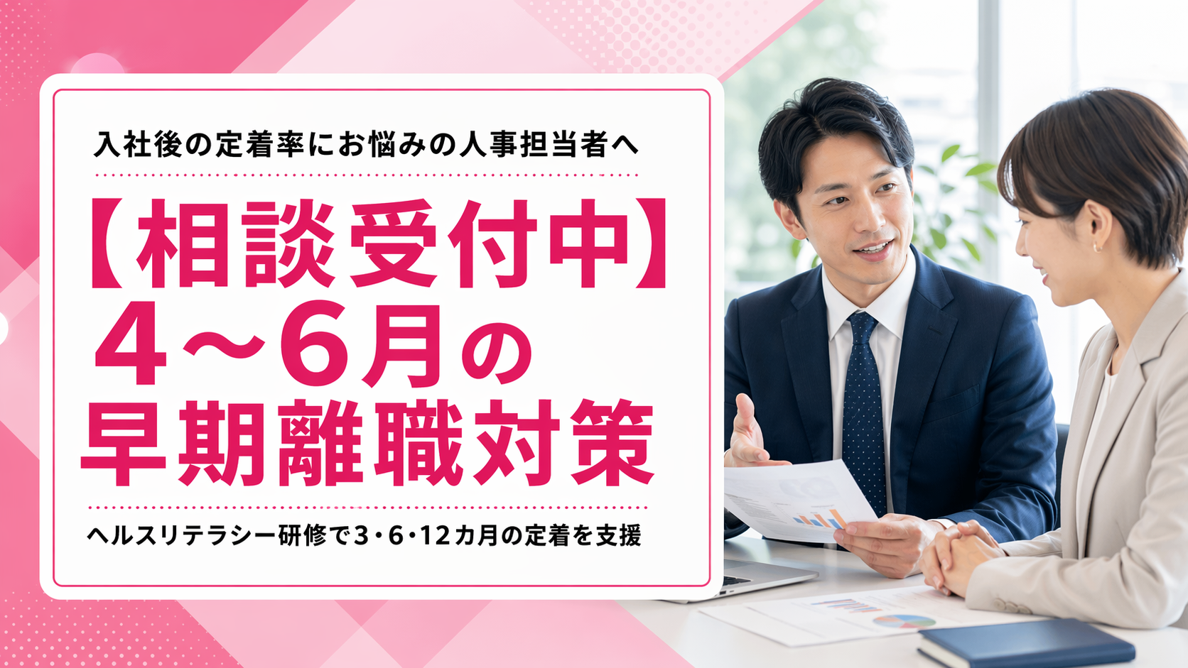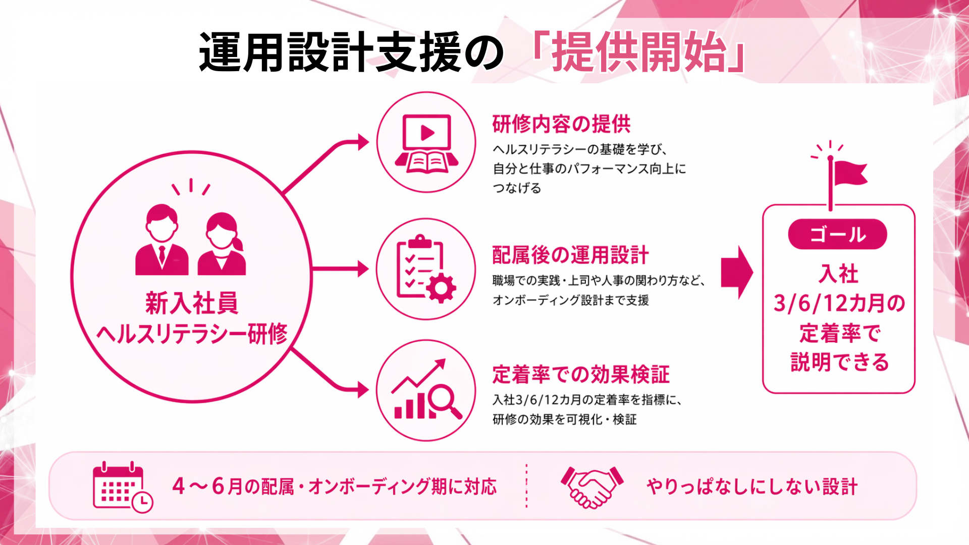 本支援は、新入社員ヘルスリテラシー研修を、4〜6月の立ち上がり期の離脱リスク対策として実装し、定着率(入社3/6/12カ月)で説明できる運用に落とし込むプログラムです。