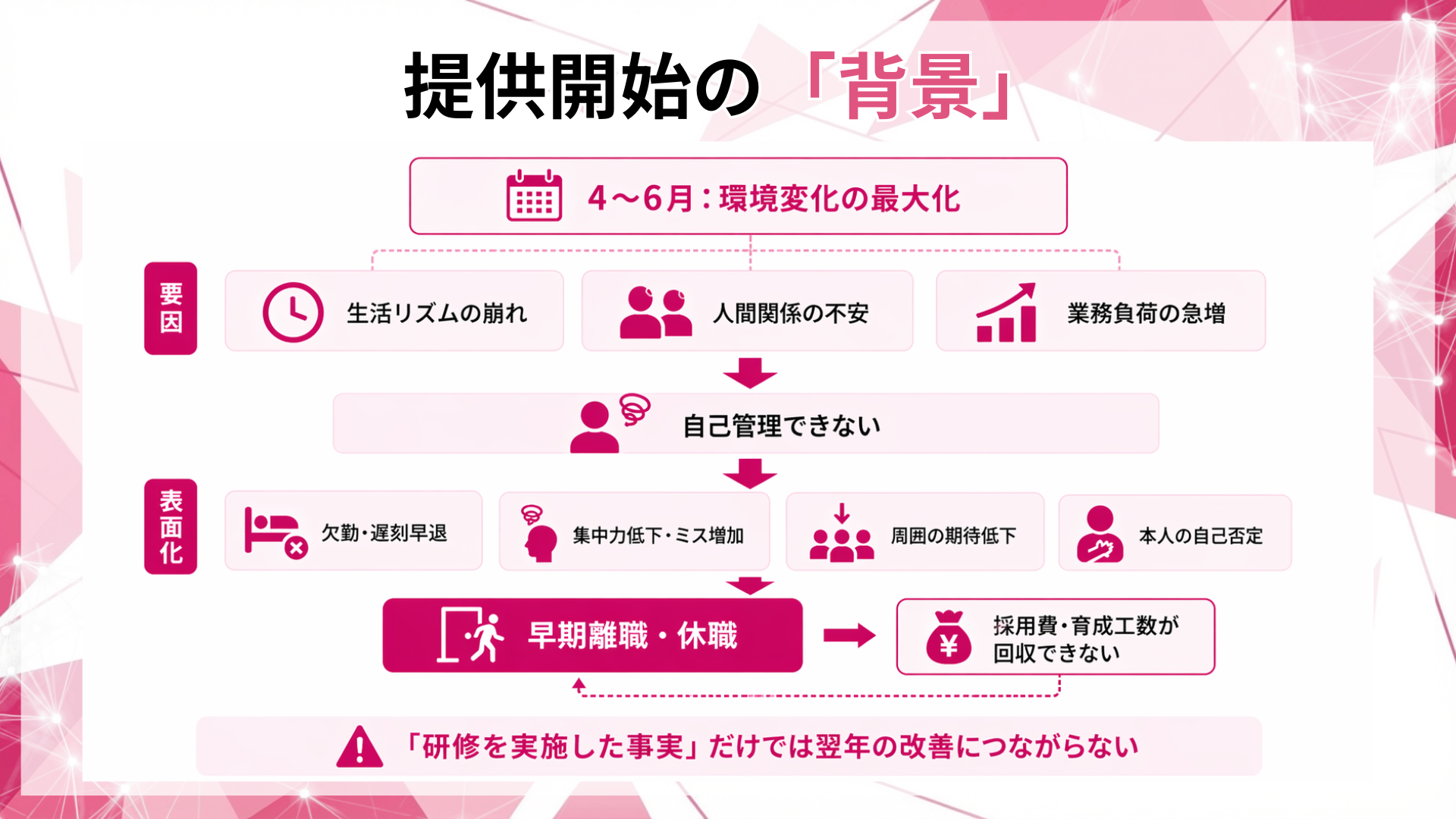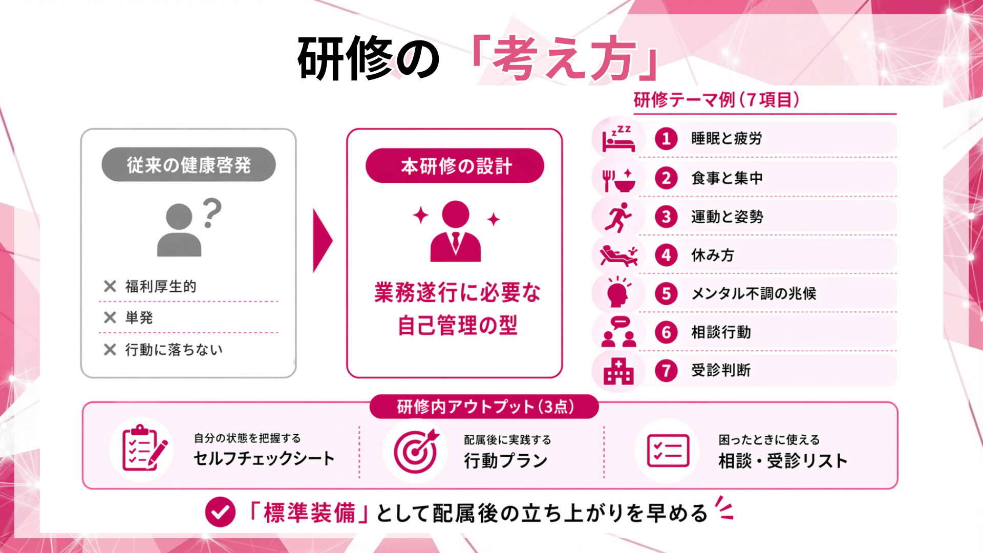 本研修は、福利厚生的な健康啓発ではなく、業務遂行に必要な自己管理の型を新入社員に標準装備させる設計です。狙いは、配属後の立ち上がりを早め、初期離脱の損失を抑えることです。