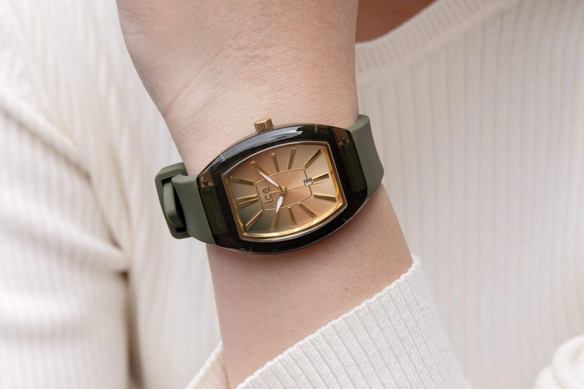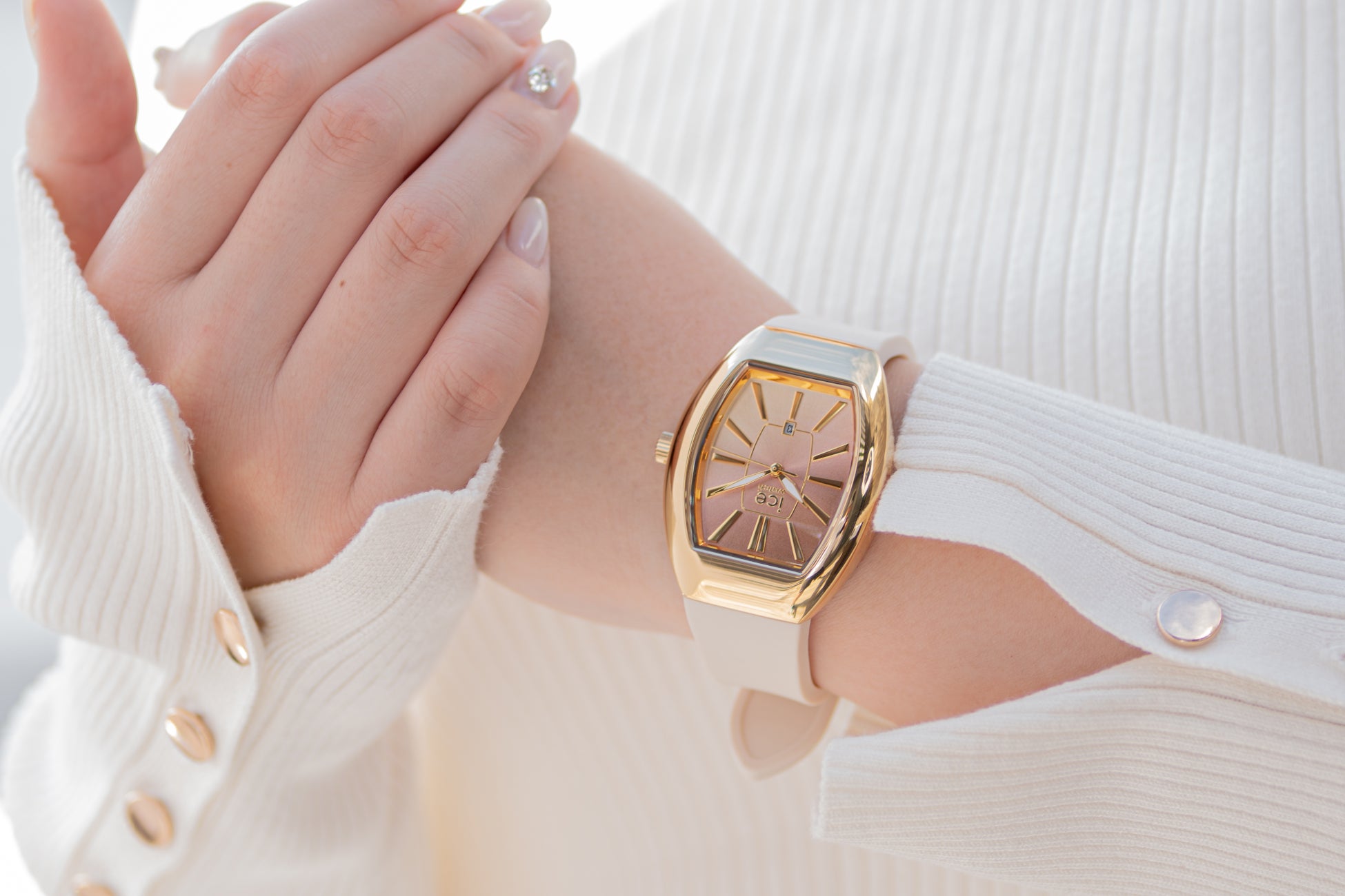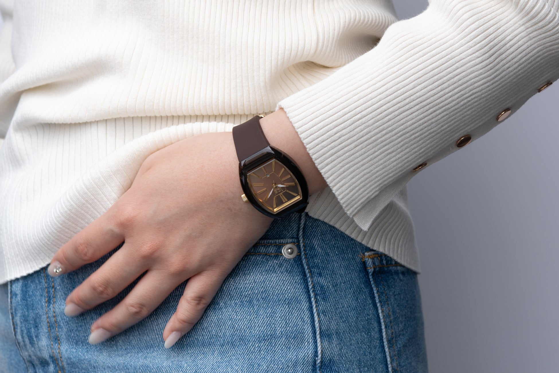 「ICE boliday dome plastic(アイスボリデイドームプラスチック)」は、こっくりとした秋冬カラーのシリコンラバーベルトと、ケースと一体化したように見えるドーム型フォルムが特徴です。半透明のプラスチックケースとグラデーションがかったサンレイダイヤルに、イエローゴールドで統一された針やインデックスが映え、カジュアルさと高級感を兼ね備えた仕上がりに。カラーはウォームトープ、ソフトピンク、オリーブグリーン、チョコレート、チェリーの全5色。秋冬の重たくなりがちな装いに、遊び心ある差し色をプラスする1本です。