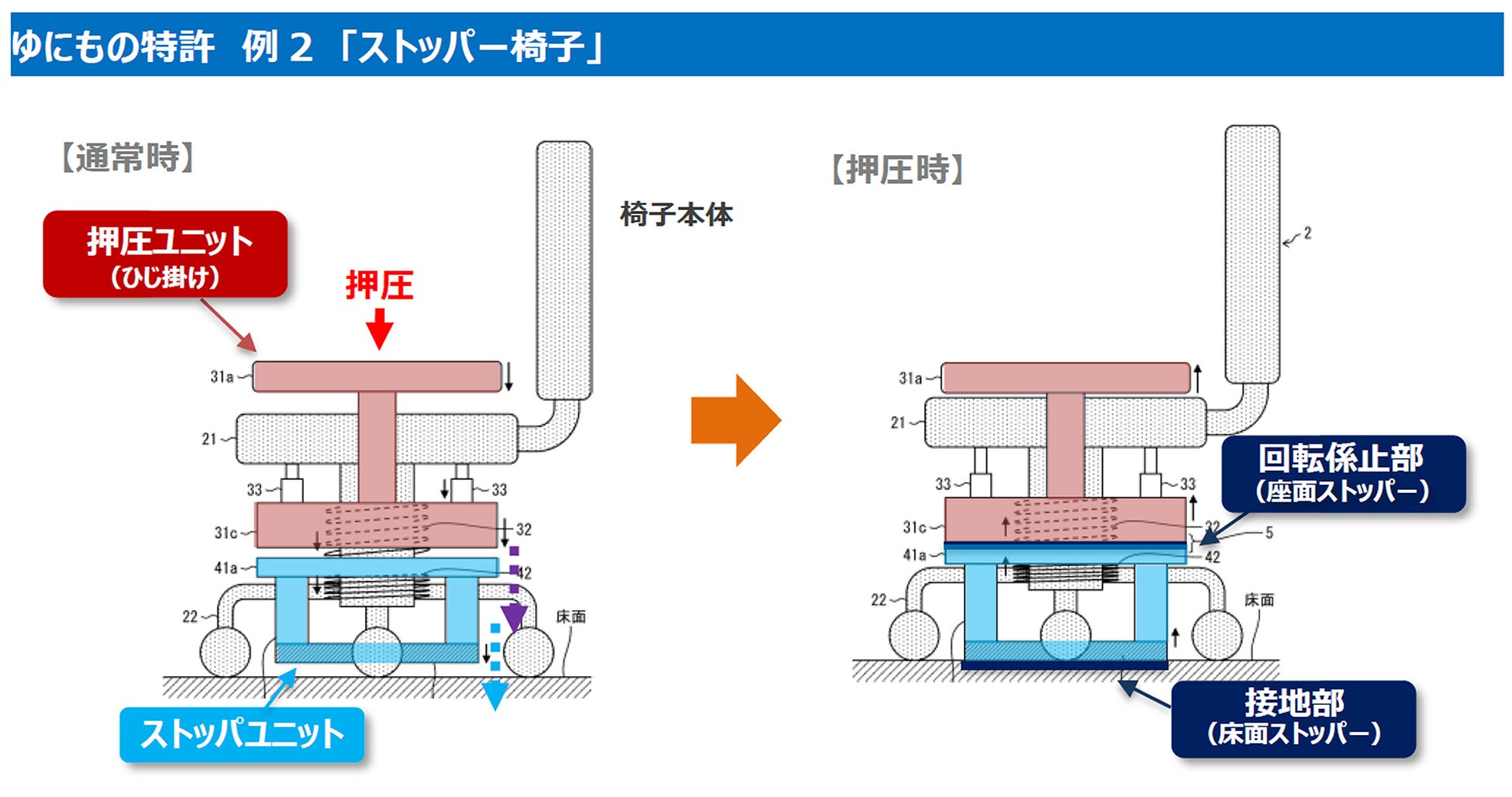 座面ストッパー機構と、さらに連動して床面に水平な移動を止められる床面ストッパー機構を設けた。