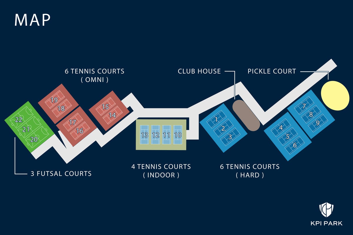 US(全米)オープンと同じサーフェスである「レイコールド」を採用した9面のハードコート、6面の砂入り人工芝コート、4面のインドアコートといった様々なテニスコートを保有している。3面のサッカーグラウンドやフットサルコートにトレーニングジムといったテニス以外のスポーツ施設も充実しています。