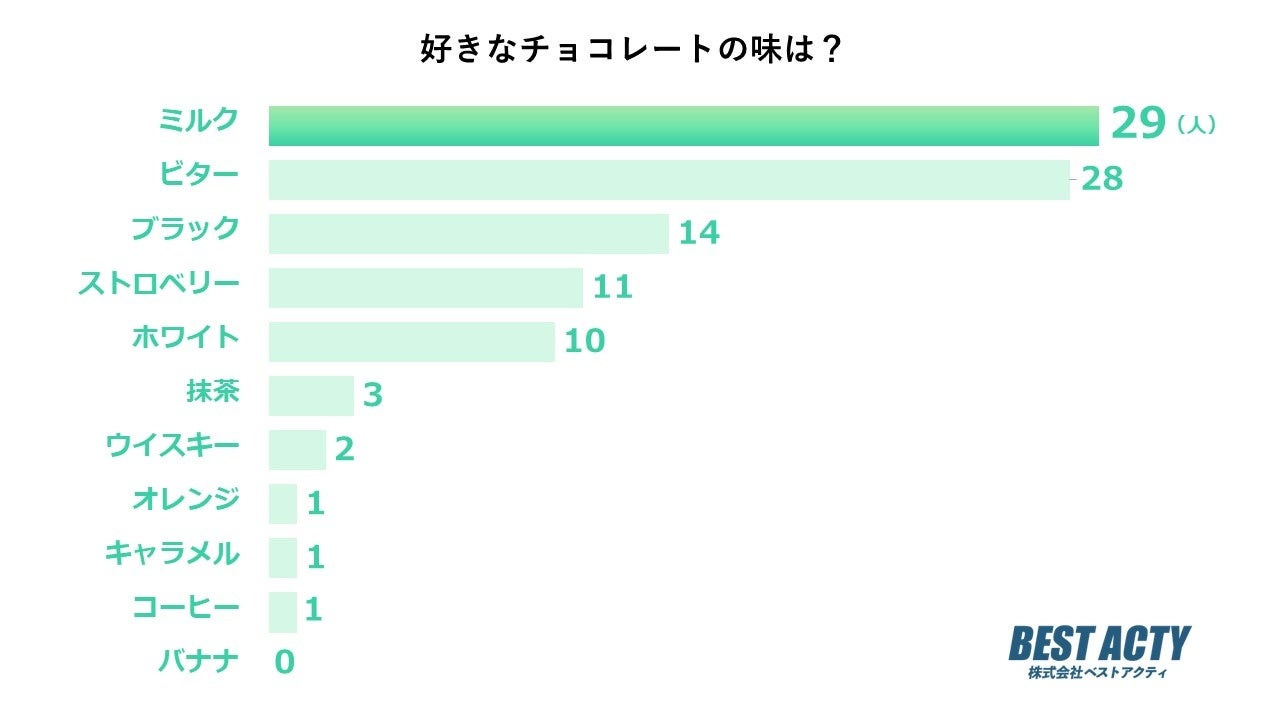 好きなチョコレートの味について100人にアンケートを行ったところ、「ミルク」と回答する人が最も多い結果となりました。