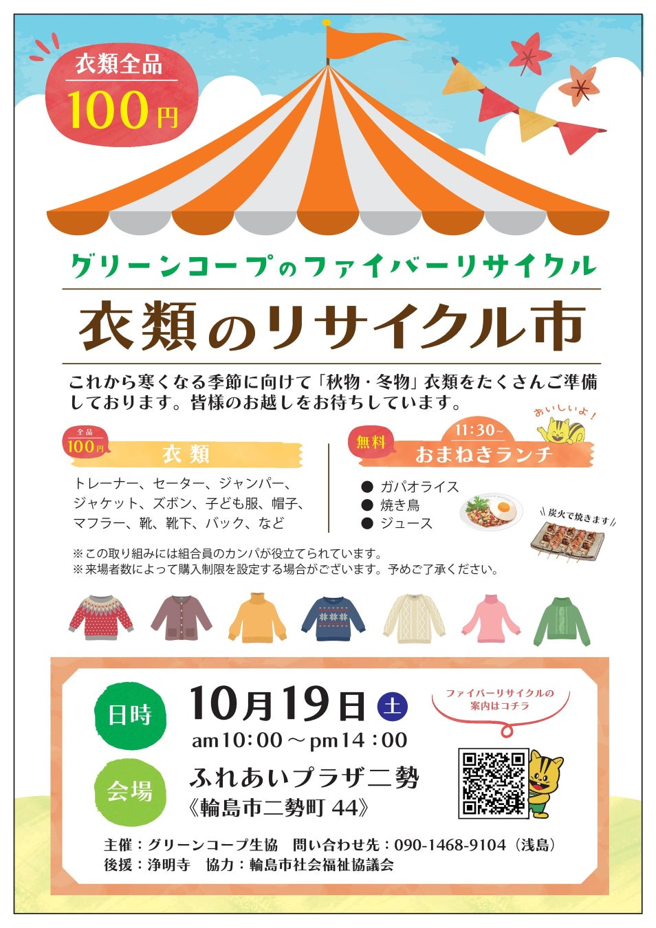 当日は、秋物・冬物を中心に「上着」「ズボン」「子ども服」「靴」などを含む500点以上の衣類を100円で販売します。さらに、11:30からはおまねきランチとして、出来立ての「焼き鳥」や「ガパオライス」を無料で提供します。