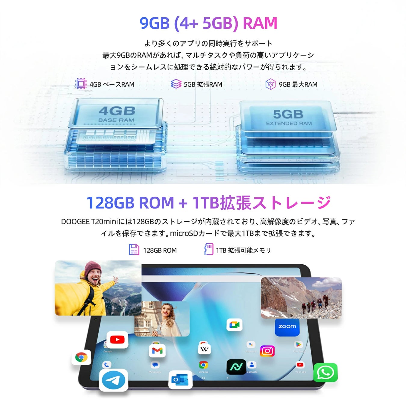 このタブレットは、9GBのRAMと128GBのROMを搭載し、1TBまでのTFカードに対応しています。これにより、アプリのマルチタスク処理や大容量のデータ保存も快適に行えます。さらに、TÜV認証を受けた目に優しいディスプレイを備えており、長時間の使用でも目の負担を軽減します。