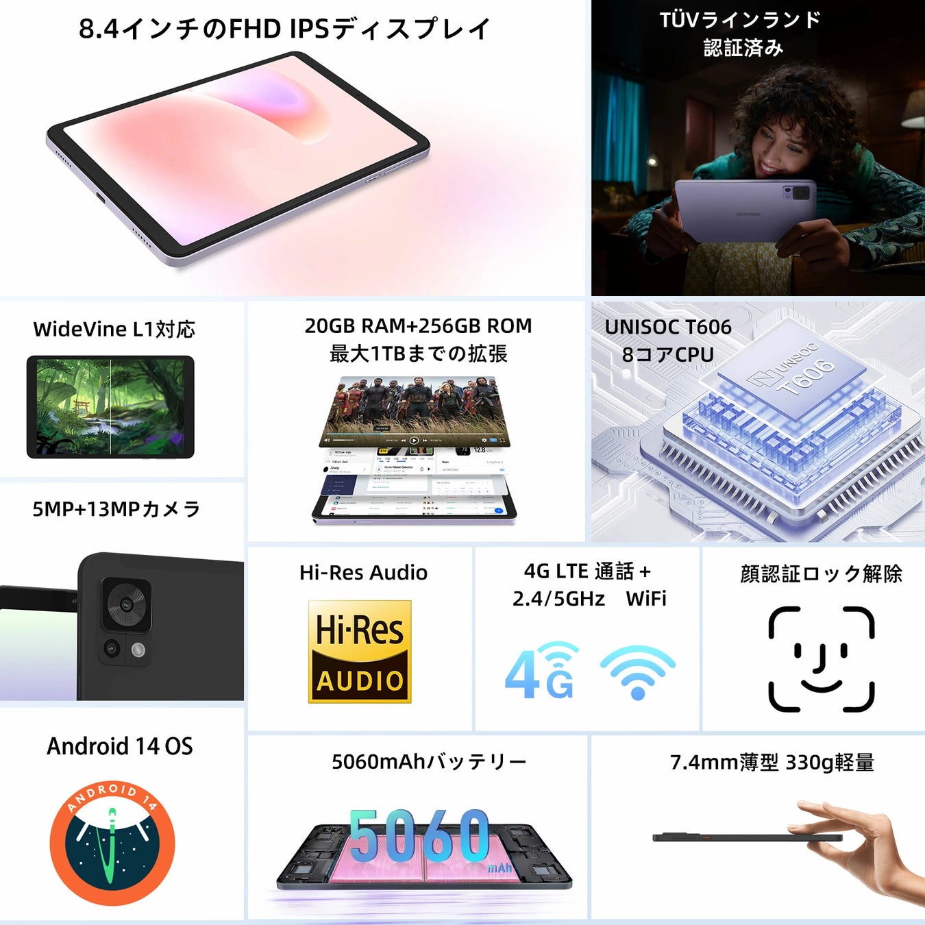特長:Android14 8.4インチ タブレット SIMフリー/5G Wi-Fiモデル RAM 9GB/ROM 128GB+1TB拡張 8コア タブレット FHD+ 2K高解像度 Widevine L1 4GLTE タブレット 13MPカメラ 5060mAhバッテリー TÜV認証 顔認識 GMS GPS 通信 DOOGEE T20 Mini