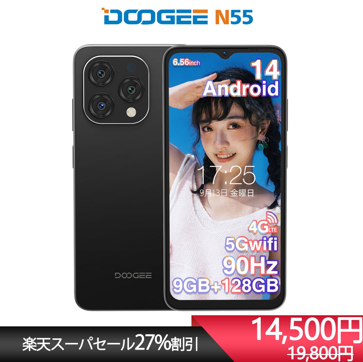 特長:Android 14 スマトーフォン SIMフリー 9GB RAM&128GB ROM+1TB拡張 90Hz リフレッシュレート DOOGEE N55 6.56インチスマホ 5150mAhバッテリー 4G LTE モバイル端末 5G WIFI WIFIモデル 携帯電話 顔認識 Widevine L1 13MP AIカメラ スマホ 通信