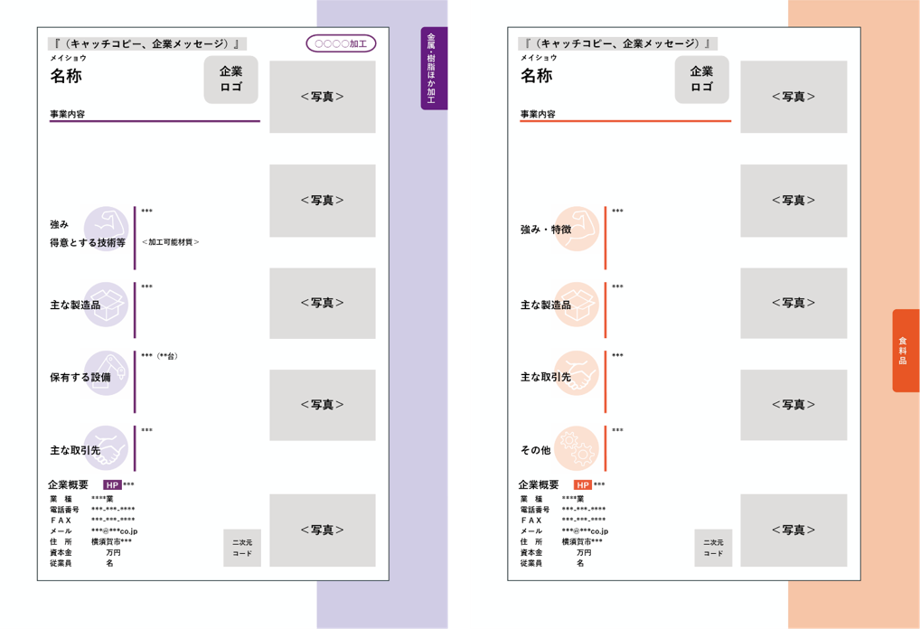 事業所・工場の事業内容や写真、「強み・得意とする技術等」、または「強み・特徴」、「主な製造品」などの項目のほか、このたび新たに「企業メッセージ」や、「キャッチコピー」、企業のホームページが確認できる「二次元コード」も掲載しています。(「キャッチコピー」、または「企業メッセージ」、「二次元コード」について掲載がないページもございます。)