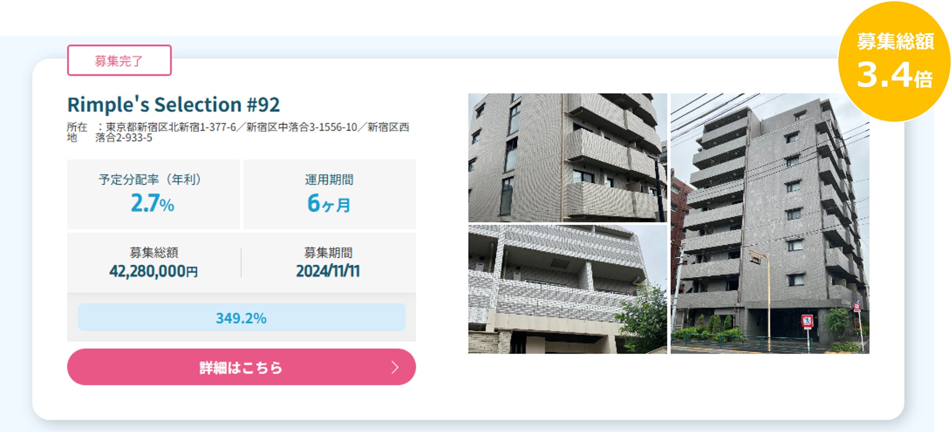 プロパティエージェントの展開する不動産クラウドファンディングRimple’s Selection#92募集総額349.2%の1.47億円の応募