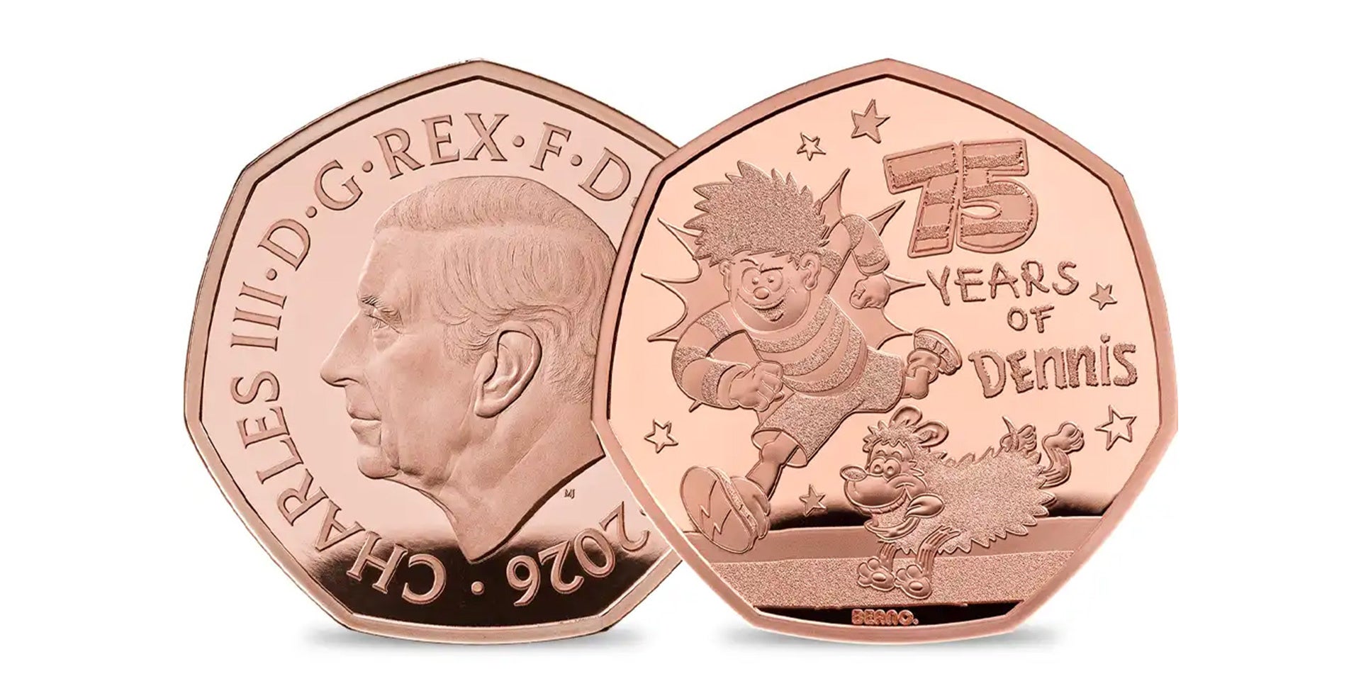 そして今回、コミック誕生75周年を記念し、デニスと愛犬ナッシャーがロイヤルミントの英国50ペンス貨として登場。