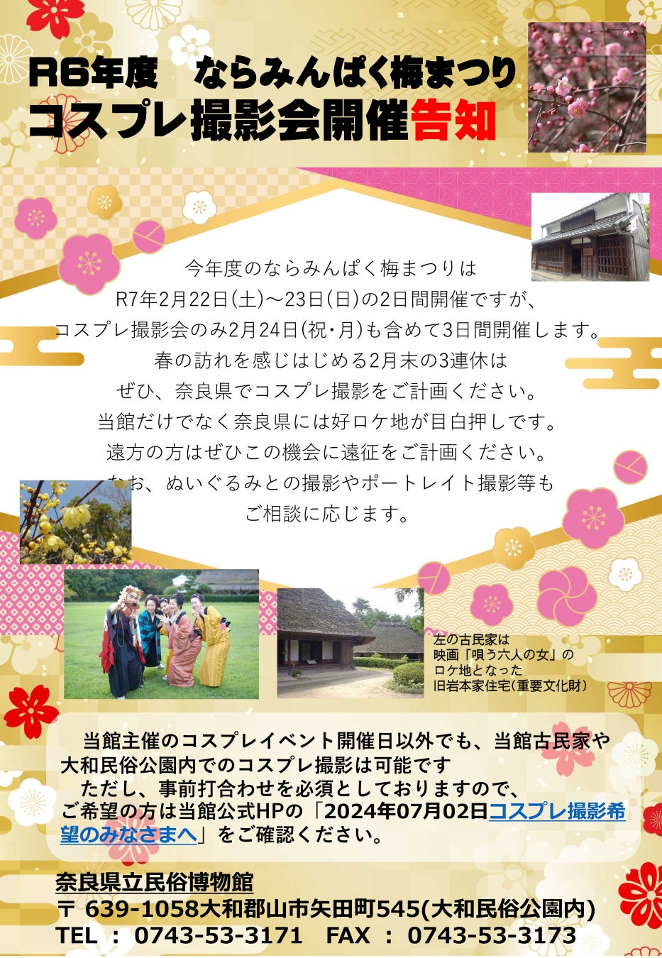 奈良県立民俗博物館・大和民俗公園では、園内の梅が見頃を迎える時期に合わせて奈良県の民俗芸能や伝統技術に触れることができるイベントを開催します。