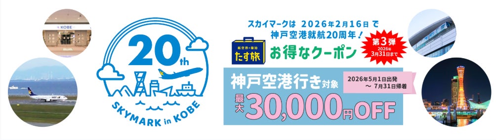 【WEB予約限定】期間限定で、スカイマーク公式ダイナミックパッケージ「たす旅」SKYMARK in KOBE 20th 第3弾を開催中。神戸空港着限定でクーポン配布♪最大30,000円OFF!
