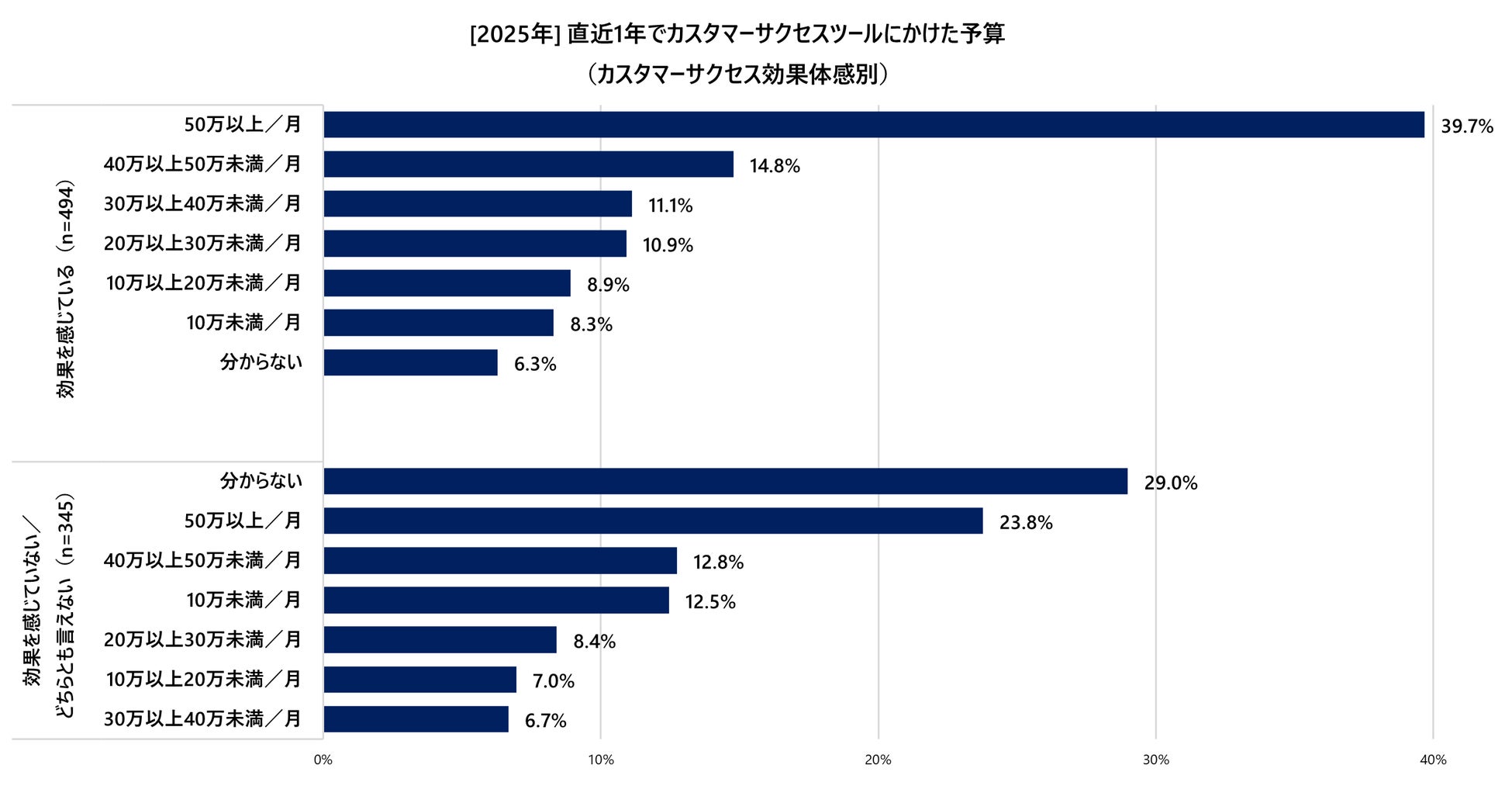 ここからは、カスタマーサクセス領域への投資に対する企業の実態を見ていきます。まず、「直近一年でカスタマーサクセスツールにかけた予算」について尋ねたところ、効果体感層では、約4割(39.7%)が「50万以上/月」と回答しており、比較的高額な投資を行うほど成果を得やすい傾向がうかがえます。一方で、効果を感じていない/どちらとも言えない効果未体感層(n=345)でも23.8%が同じく月50万以上と回答しており、投資額の高さだけでは十分な効果を保証できないことも明らかです。