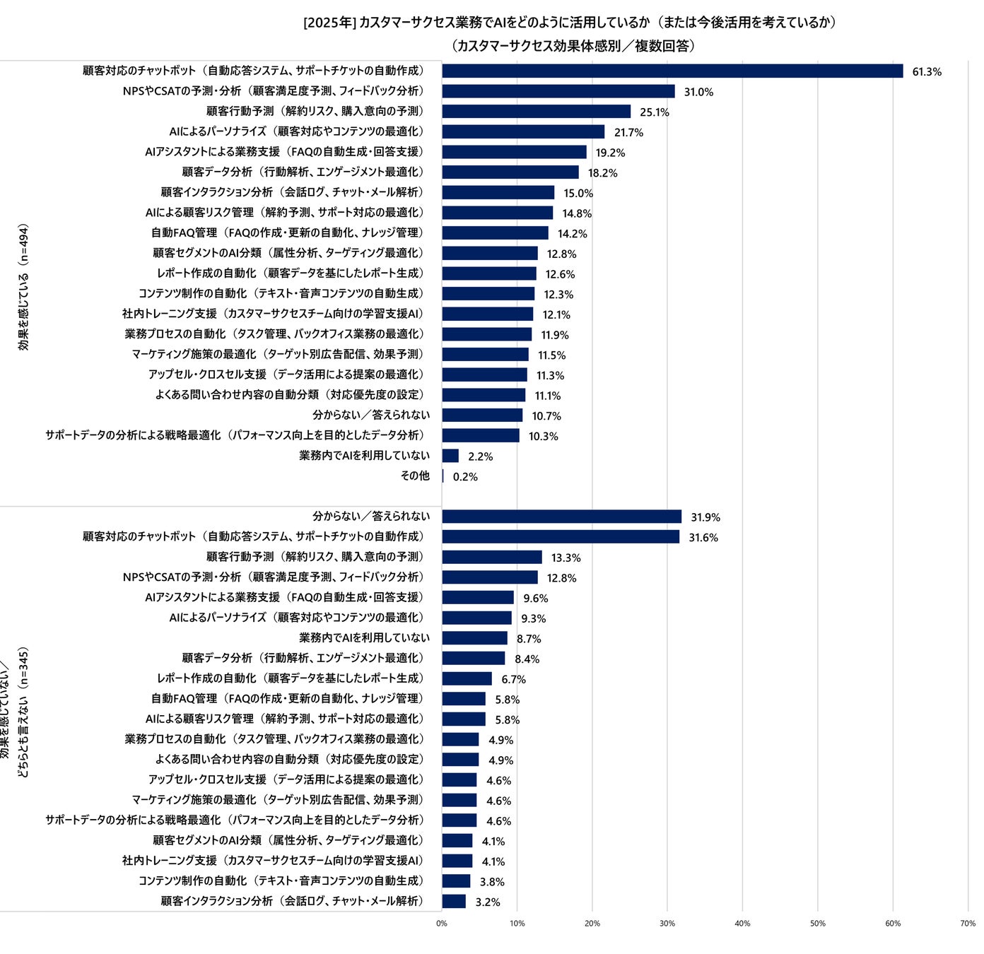 まず初めに、カスタマーサクセスに取り組んでいる人に対して、カスタマーサクセス業務においてAIをどのように活用しているか、または今後どのような活用を検討しているのかを尋ねました。カスタマーサクセスの効果を感じている効果実感層(n=494)では、まず顧客対応におけるチャットボットが61.3%と圧倒的に高い割合を示しており、基本的な自動応答システムやサポートチケットの自動作成が、業務効率の向上や顧客満足度の改善に寄与していると考えられます。また、より高度な分析ツールとして、NPSやCSATの予測・分析(31.0%)、顧客行動予測(25.1%)、およびAIによるパーソナライズ(21.7%)が導入され、単なる自動化以上の価値創出を目指していることが分かります。