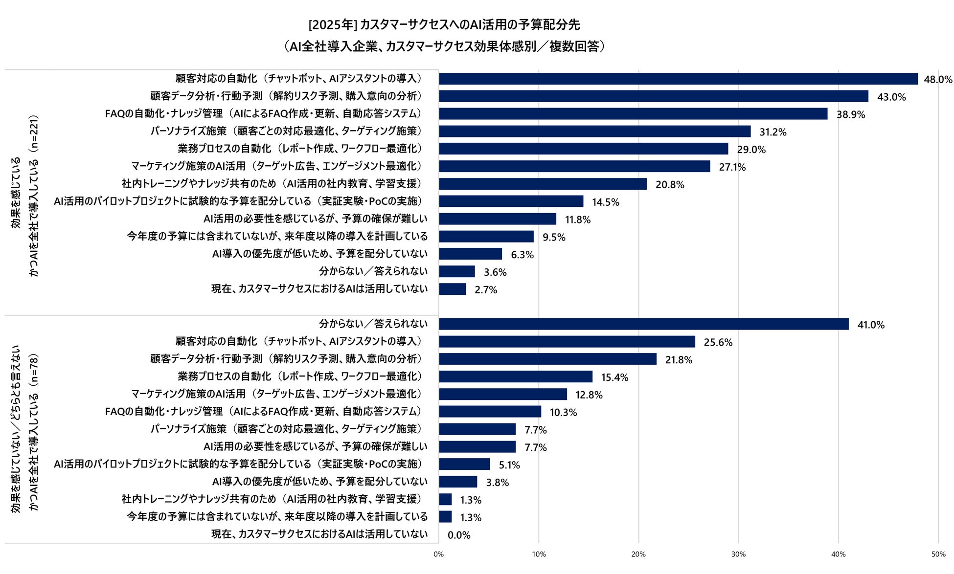 全体として、カスタマーサクセスにおける取り組みは、基本的なチャットボットの自動応答から高度なNPS予測やパーソナライズ施策まで、多岐にわたるAI活用が進む一方で、効果実感の有無による運用や投資額に大きな差が見受けられます。効果を実感している企業は、比較的高額な予算配分と具体的な施策(顧客離脱防止、正しい販売、利用状況のモニタリングなど)を通じて顧客満足度や業績向上を実現しているのに対し、効果未実感層では予算配分や運用体制の整備が不十分であり、今後の改善が求められる状況です。これらの結果は、単なるツール導入にとどまらず、組織全体での意識改革と戦略的な投資、さらに継続的な改善活動が、カスタマーサクセスの本質的な成功を実現するための鍵であることを、改めて浮き彫りにしています。