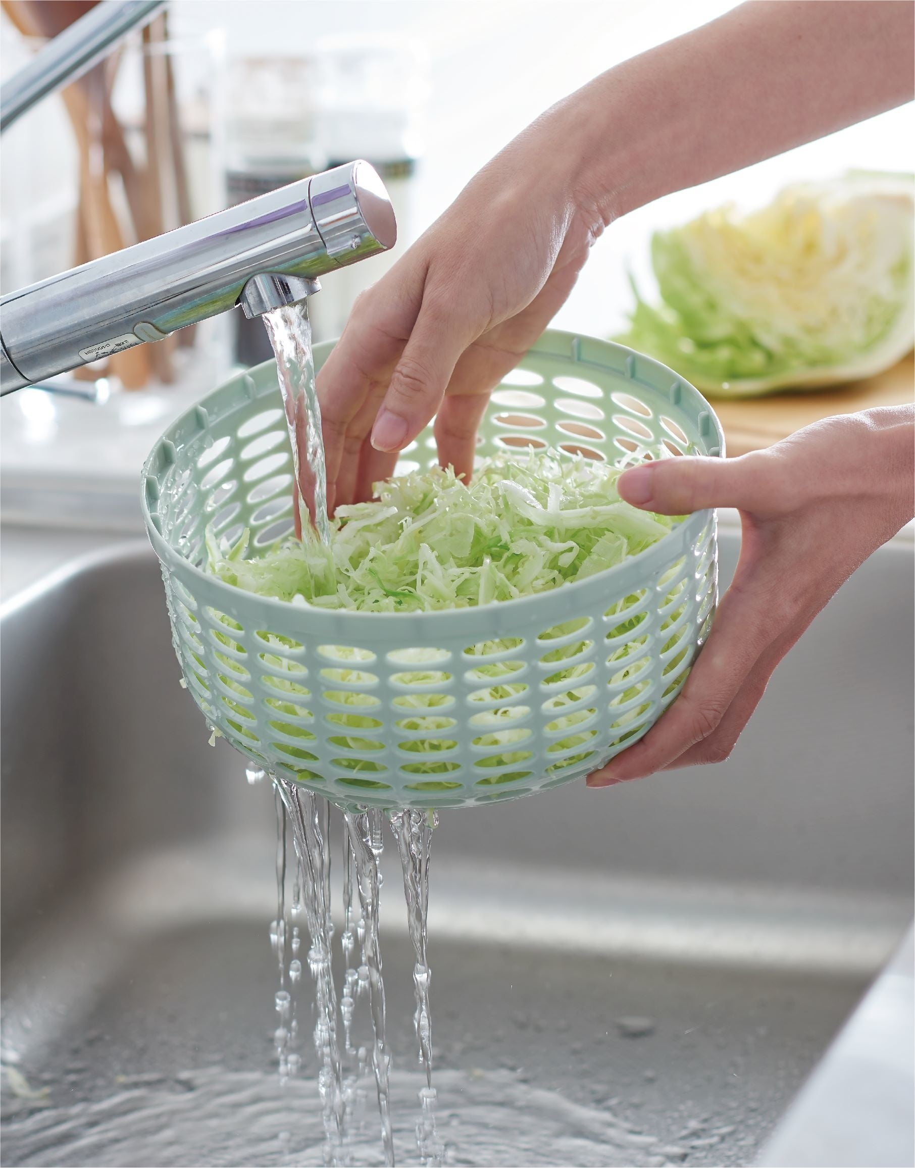洗った野菜を入れたらハンドルをセットしてプッシュするだけ。高速回転で野菜の水分をしっかり水切りします。水分が切れた野菜はシャキッとした歯ごたえで、毎日のサラダをもっとおいしく食べたい方に最適な商品です。中のバスケットは取り外しができ、野菜の水洗いにも便利!ハンドルは縮められて収納時はコンパクトに。全部のパーツがバスケットの中へぴったり収まる仕様です。