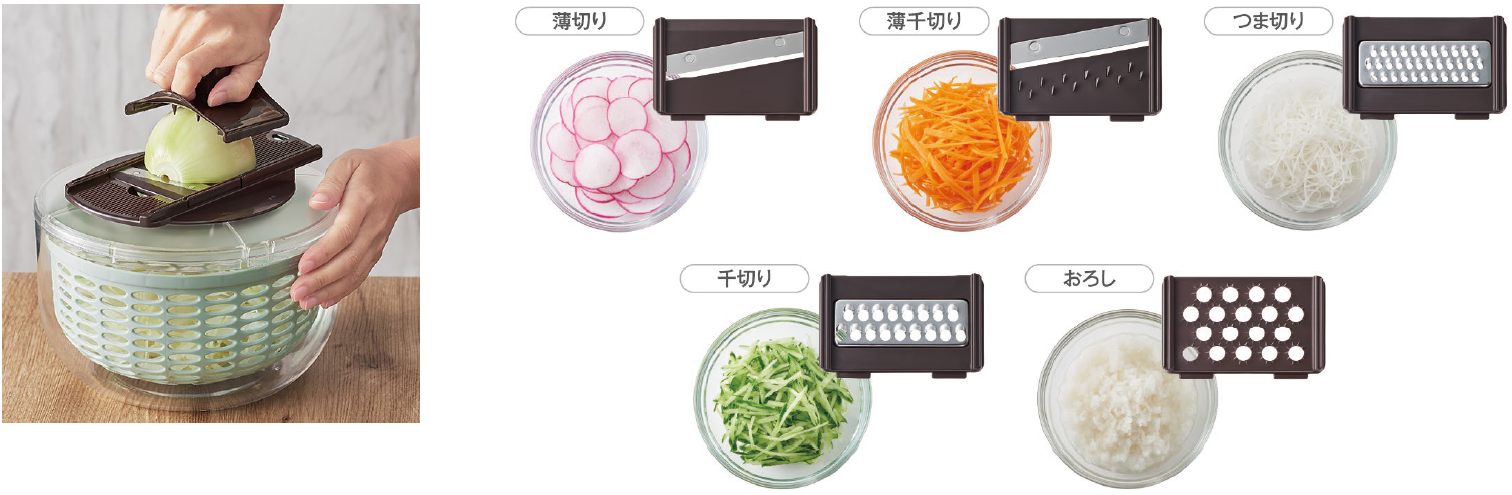サラダスピナーは上からハンドルをプッシュするだけ。高速回転でしっかり水切りができます。ハンドルをカッタープレートへ付け替えればスライサーに早変わり。5種類のカッターパーツ(薄切り、薄千切り、つま切り、千切り、おろし)」を使って、用途に合わせたスライスが可能です。1台で毎日のサラダ作りや食材の下ごしらえに大活躍!