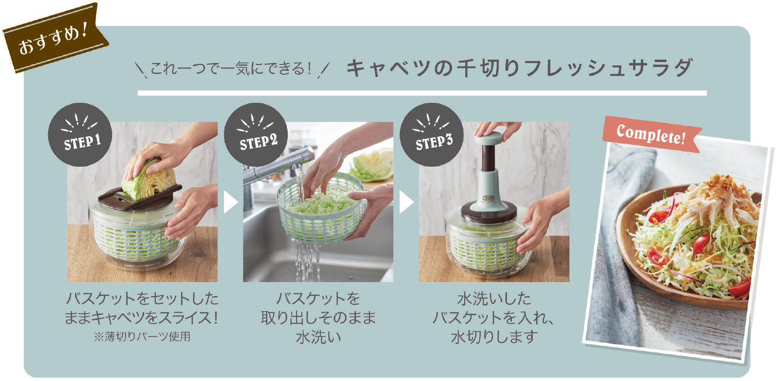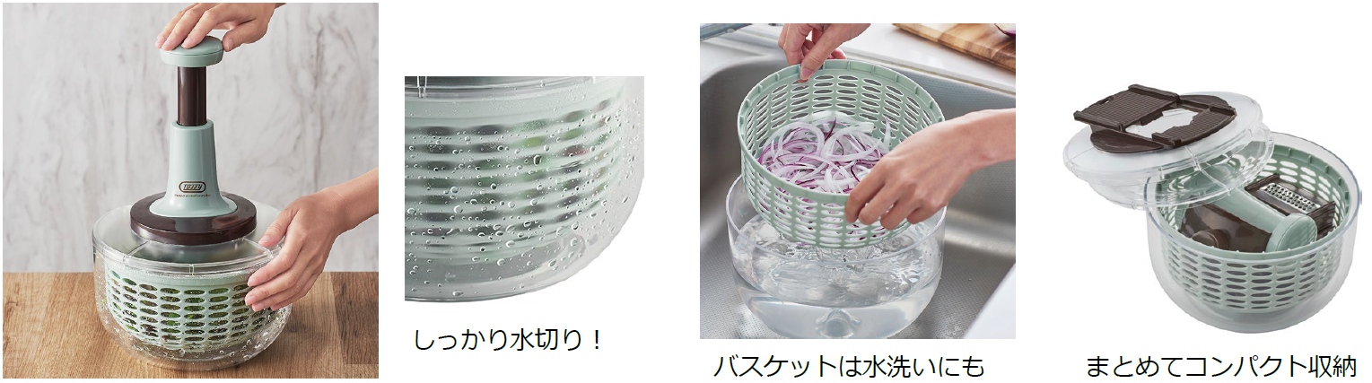 本製品は、ハンドルを押すだけで高速回転するサラダスピナーに便利なスライサー用のカッターパーツが5種類入ったセット。サラダスピナーの「水切り」に加え、カッターパーツをセットして「スライス」、バスケットを使用して「水洗い」も可能な、1つで多彩に使える便利なキッチンツールです。