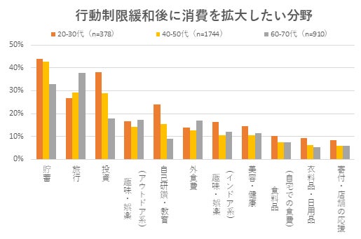 コロナ禍の行動制限緩和後、どの目的に使う金額を増やしたいかを聴取しました。最も割合が高いのは50代以下では「貯蓄」、60代以上では「旅行」と、年代によって消費の方向が大きく異なります。