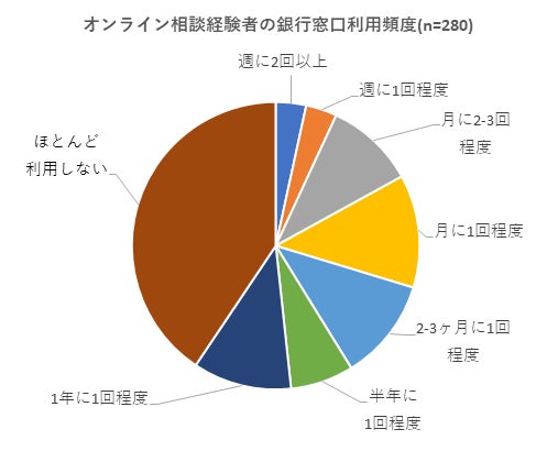 銀行で実際にオンライン相談を利用したことがあると回答した人の銀行窓口の利用頻度を見ると、「ほとんど利用しない」「1年に1回程度」で過半数を占めています。窓口利用者の一部がオンラインに乗り換えたケースもあるでしょうが、従来来店相談につなげることができなかった層をオンライン相談で取り込めた可能性があります。未経験者でもオンライン相談の利用意向は高く、オンライン相談への取り組みが今後の相談ニーズの取り込みを左右しそうです。