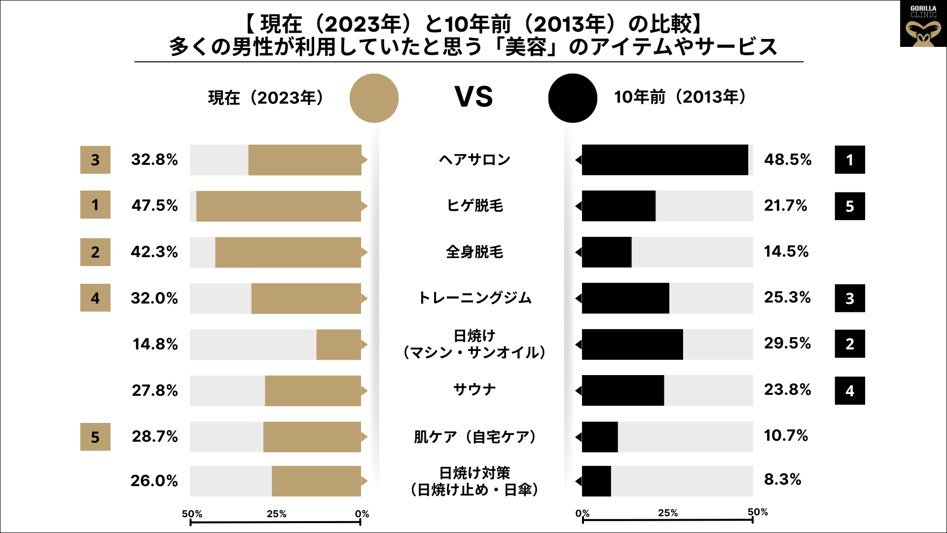 【10年前(2013年)に流行していた「メンズ美容」といえば?】の問いでは、各世代ともに「①ヘアサロン(美容室) ②日焼け(マシン・サンオイル) ③トレーニングジム」の順でしたが、【現在(2023年)に流行している「メンズ美容」といえば?】では、1位に「ヒゲ脱毛(47.5%)」2位に「全身脱毛(42.5%)」がランクイン。10年前のトップ回答だった「ヘアサロン(美容室)」は3位に入るなど、流行の移りを感じさせる結果が得られました。